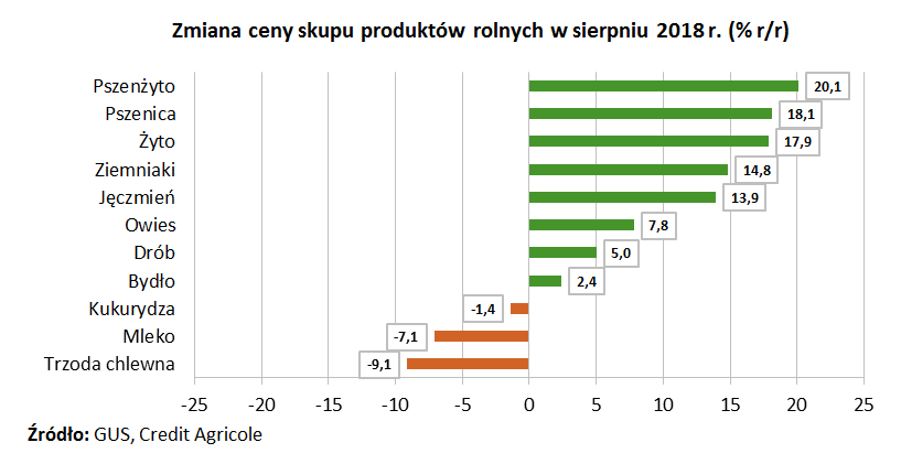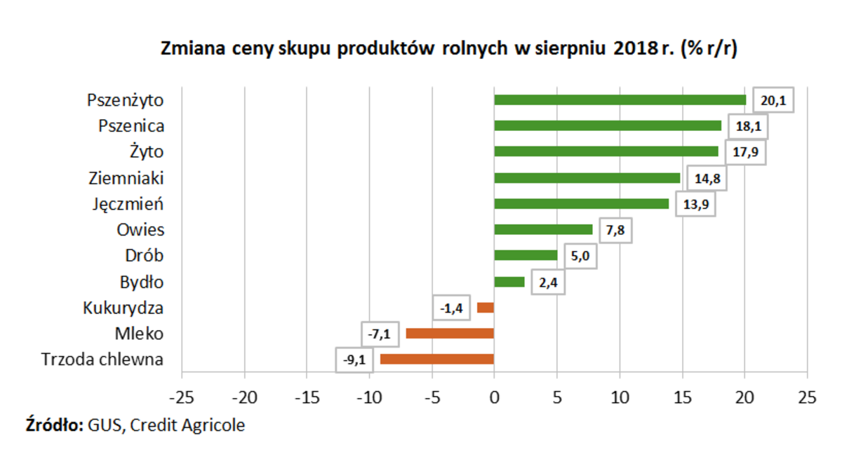 <p style="text-align: justify;">GUS opublikował dziś dane nt. cen skupu produktów rolnych w sierpniu 2018 r. Wskazały one na szeroki zakres wzrostu cen w ujęciu rocznym. Najsilniej wzrosły ceny zbóż (pszenżyta o 20,1% r/r, pszenicy o 18,1%, żyta o 17,9% oraz jęczmienia o 13,9%), co jest efektem suszy jaka wystąpiła w br. w Europie. </p>