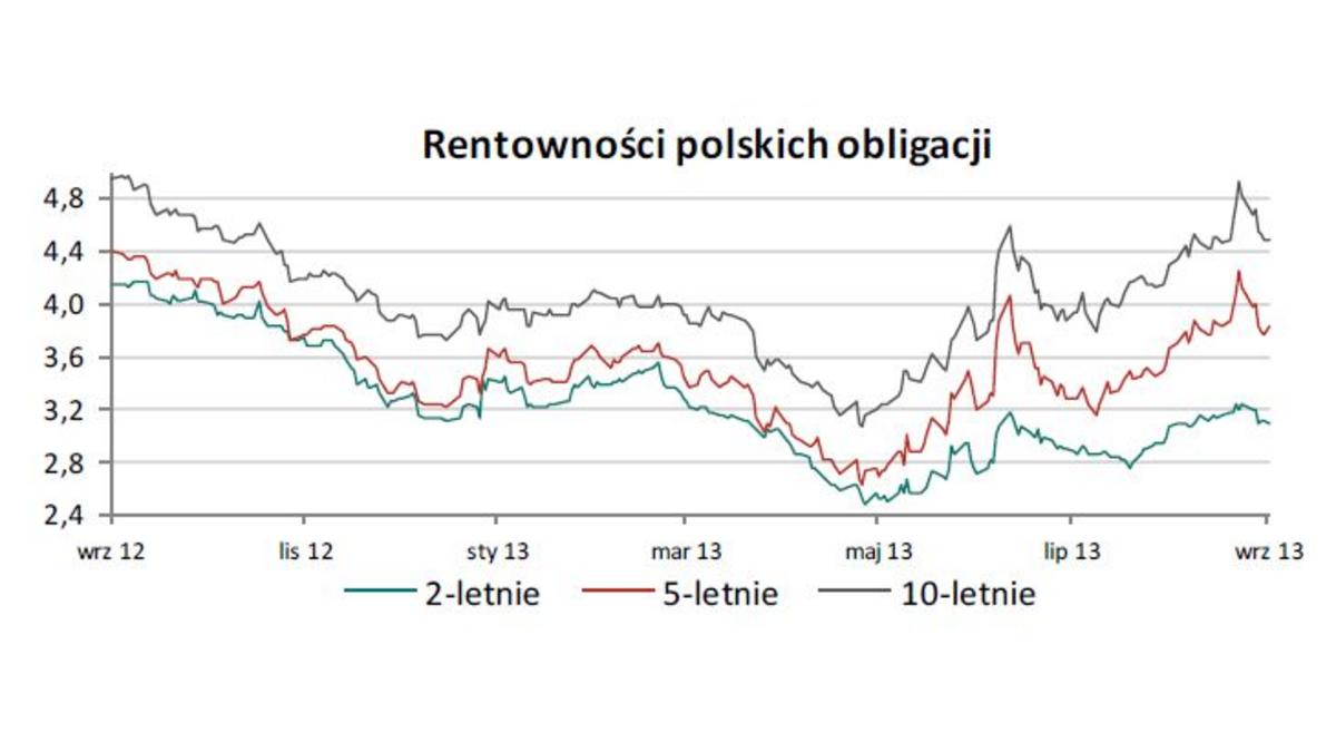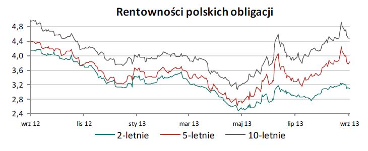 W poniedziałek polski dług odrabiał straty z poprzedniego tygodnia wywołane przedstawieniem propozycji rz?dowej w sprawie funkcjonowania systemu emerytalnego. We wtorek z uwagi na ubogi kalendarz makroekonomiczny polskie obligacje pozostawały pod wpływem dobrych nastrojów globalnych, wywołanych stabilizacj? sytuacji w Syrii, które wpierały jego dalsz? korektę. Środa była kolejnym dniem zmniejszenia rentowności na całej długości krzywej. W czwartek nast?piło wyhamowanie wzrostu cen polskich obligacji, wywołane bardzo dobrymi danymi z amerykańskiego rynku pracy. W pi?tek ceny polskiego długu na całej długości w dalszym ci?gu rosły wsparte przez słabe dane z amerykańskiej gospodarki (sprzedaż detaliczna i Indeks Uniwersytetu Michigan). W tym tygodniu oczekujemy lekkiego wzrostu rentowności polskich obligacji wywołanej odpływem kapitału z rynków wschodz?cych, po tym jak, zgodnie z naszymi oczekiwaniami FED ogłosi rozpoczęcie ograniczania programu QE3.