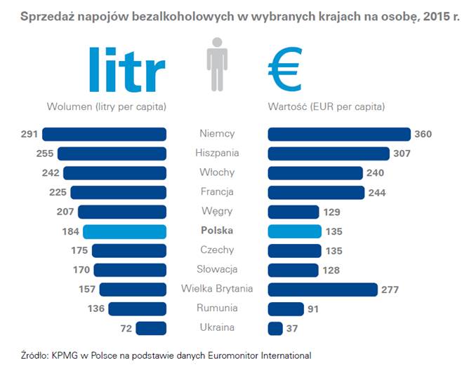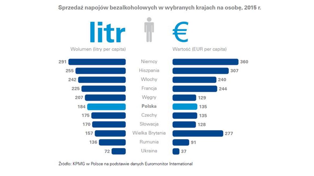 W ci?gu roku statystyczny Polak kupuje 184 litry napojów bezalkoholowych, wydaj?c na nie równowartość 135 euro. Polacy nabywaj? mniej napojów niż Niemcy (291 litrów), Hiszpanie (255 litrów) czy Francuzi (225 litrów), ale więcej niż Brytyjczycy (157 litrów) czy Ukraińcy (72 litry).