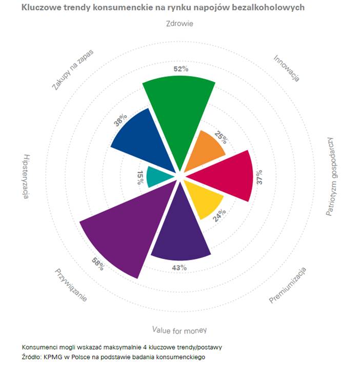 Polski rynek napojów bezalkoholowych w dużej części uzależniony jest od nastrojów konsumenckich oraz trendów produktowych. Aż połowa wszystkich konsumentów wyj?tkowo ceni dobry skład produktów i wybiera napoje bez sztucznych dodatków, takie, które uważa za zdrowe. Polscy konsumenci staj? się coraz bardziej świadomi roli zdrowego stylu życia oraz funkcjonalności, których pewne napoje mog? im dostarczyć.