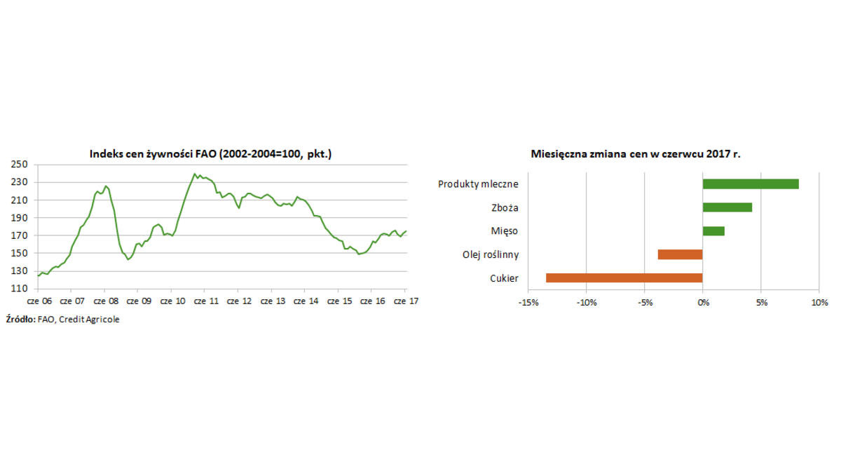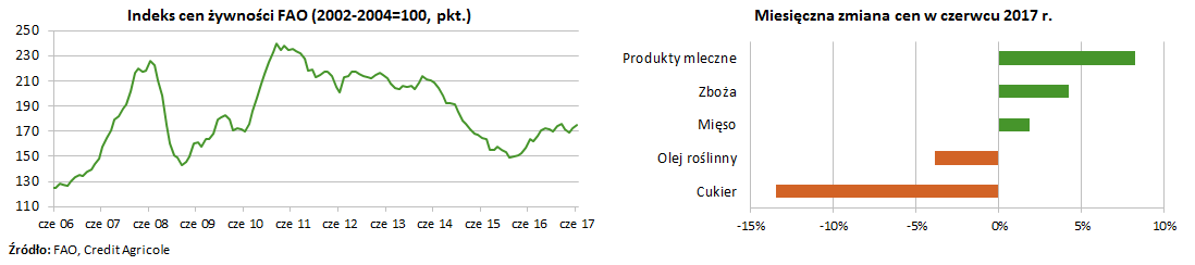 <p style="text-align: justify;">Indeks cen żywności FAO zwiększył się w czerwcu do 175,2 pkt. wobec 172,7 pkt. w maju (+1,4% m/m). Wzrost indeksu w ujęciu miesięcznym wynikał z wyższych cen 3 z 5 jego składowych: produktów mlecznych (+8,3% m/m), zbóż (+4,2% m/m) oraz mięsa (+1,8% m/m). Przeciwny efekt miały niższe ceny cukru (-13,4% m/m) oraz oleju roślinnego (-3,9% m/m). Roczne tempo wzrostu światowych cen żywności zmniejszyło się w czerwcu do 6,9% wobec 10,2% w maju, co wynikało przede wszystkim z silnego spadku rocznej dynamiki cen cukru (-28,5% w czerwcu wobec -5,2% w maju).</p>