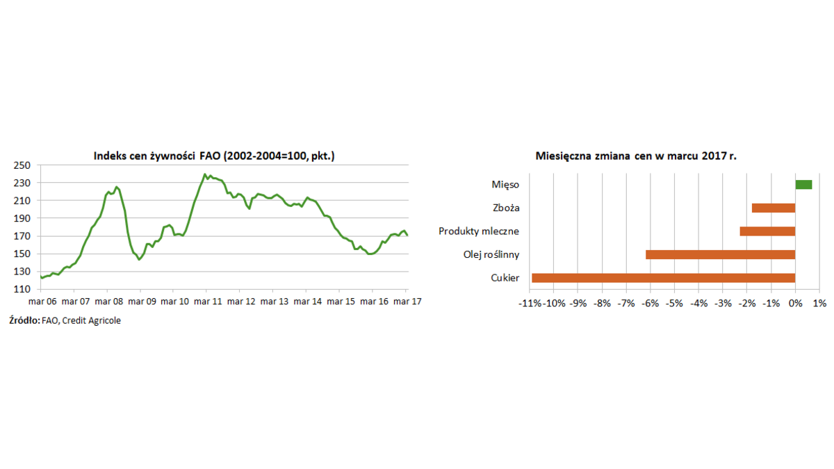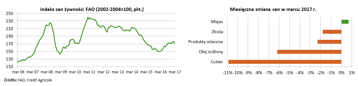 <p style="text-align: justify;">Indeks cen żywności FAO zmniejszył się w marcu do 171,0 pkt. wobec 175,8 pkt. w lutym (-2,8% m/m), co jest jego najsilniejszym miesięcznym spadkiem od sierpnia 2015 r. Spadek indeksu w ujęciu miesięcznym wynikał z niższych cen 4 z 5 jego składowych: cukru (-10,9% m/m), oleju roślinnego (-6,2% m/m), produktów mlecznych (-2,3% m/m) oraz zbóż (-1,8% m/m). Wzrost cen odnotowano jedynie w przypadku mięsa (+0,7%).</p>