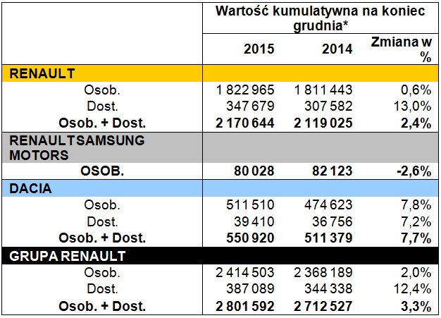 Rok 2015 to kolejny rok, w którym wzrasta sprzedaż Grupy Renault. Bijemy kolejny rekord. Pomimo zróżnicowanej sytuacji gospodarczej w poszczególnych regionach odnotowujemy stały wzrost, który potwierdza słuszność przyjętej wiele lat temu strategii dywersyfikacji geograficznej – podkreśla Thierry Koskas, dyrektor handlowy Grupy.