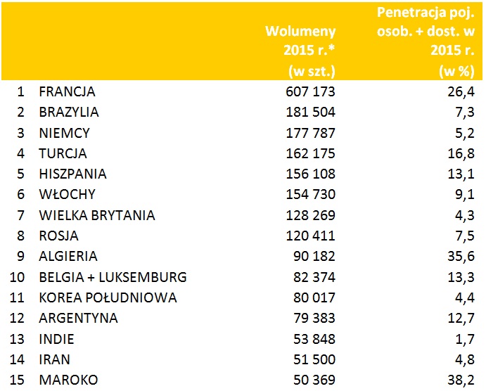 15 rynków głównych Grupy Renault na koniec grudnia 2015 r.