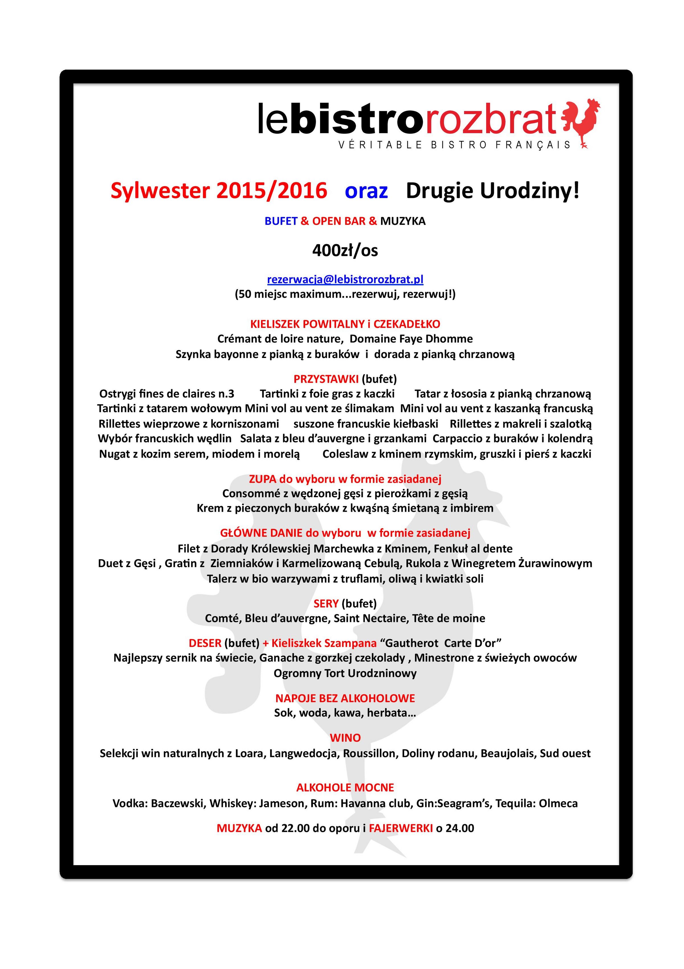 <p style="text-align: justify;">Le Bistro Rozbrat zaprasza na zabawę sylwestrową. Nie zabraknie wybornych dań kuchni francuskiej, doskonałych deserów i muzyki tanecznej bo białego rana. Sylwestrowa noc będzie również doskonałą okazją do świętowania drugich urodzin restauracji.</p>