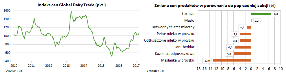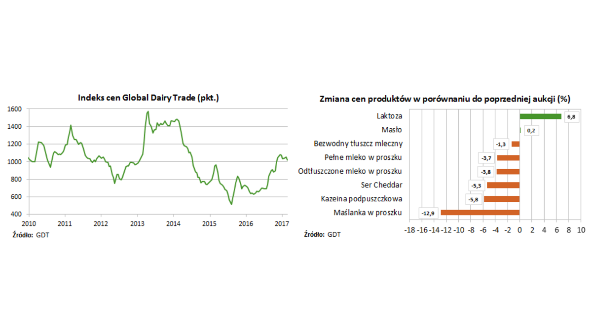 <p style="text-align: justify;">Dzisiaj odbyła się aukcja produktów mlecznych na platformie aukcyjnej Global Dairy Trade (GDT) w Nowej Zelandii. Indeks cen GDT zmniejszył się na niej do 1020 pkt. wobec 1054 pkt. na poprzedniej aukcji, która miała miejsce 7 lutego br. (spadek o 3,2%), co było wyraźnie poniżej oczekiwań rynku przybliżanych kontraktami terminowymi na pełne mleko w proszku, odtłuszczone mleko w proszku oraz bezwodny tłuszcz mleczny na giełdzie w Nowej Zelandii.</p>