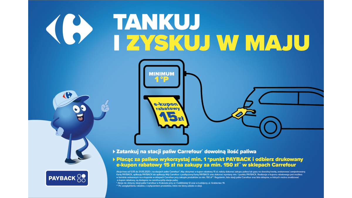 Każda transakcja paliwowa na stacjach Carrefour umożliwia zbieranie punktów PAYBACK. To element trwającej współpracy Carrefour i PAYBACK, w ramach której klienci korzystają ze wszystkich korzyści największego w Polsce multipartnerskiego programu lojalnościowego. Dzięki promocji majowej, można jeszcze łatwiej oszczędzać przy codziennych zakupach z kartą PAYBACK.