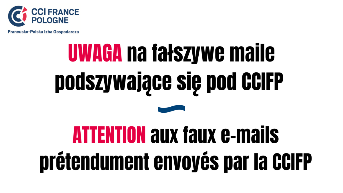 Otrzymaliśmy informacje o wiadomościach e-mailowych, które podszywają się pod Francusko-Polską Izbę Gospodarczą (CCIFP) i jej pracowników. Mogą one zawierać podejrzane linki lub prośby o podanie danych osobowych czy finansowych.
