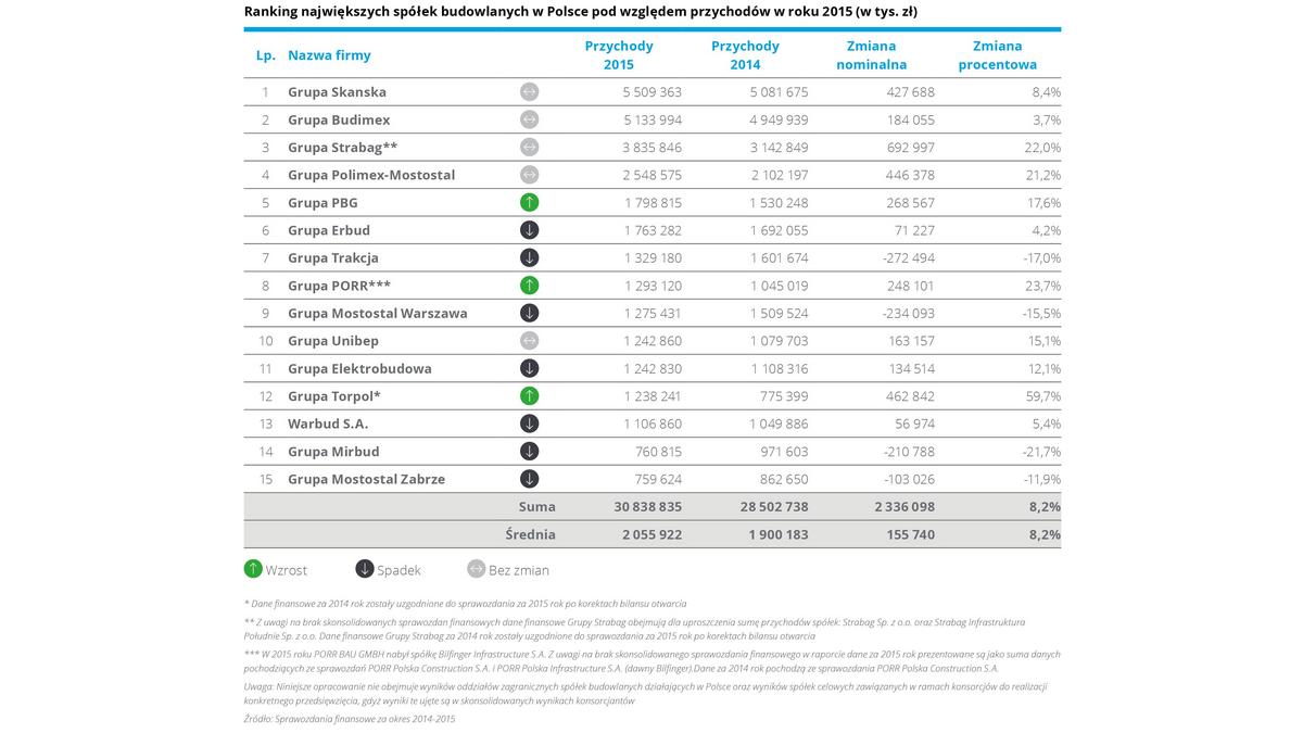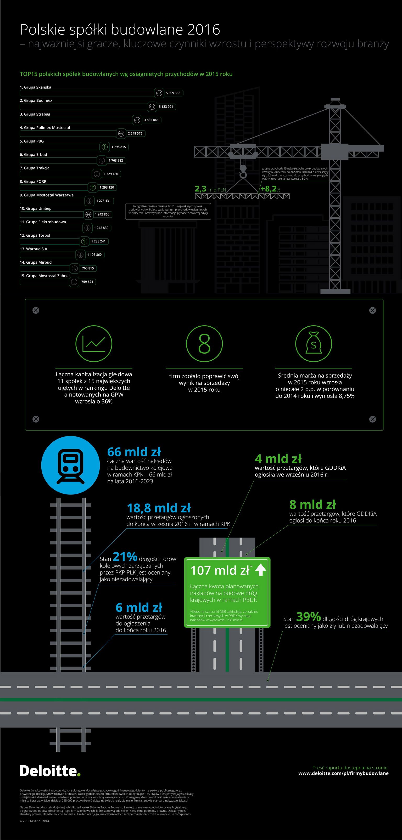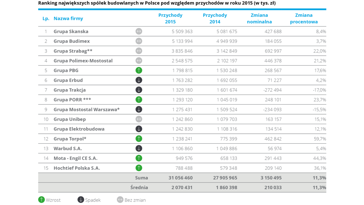 Z analizy przygotowanej przez Deloitte wynika, że w 2015 roku ł?czne przychody piętnastu największych spółek wzrosły o blisko 2,3 mld zł, co stanowi ponad 8,2 proc. wzrost rok do roku. Było to skorelowane z lepszym wynikiem zarówno na poziomie działalności operacyjnej, jak i na poziomie wyniku netto. „Po raz pierwszy wszystkie podmioty tworz?ce poprzedni ranking, znalazły się w nim również w kolejnym roku. Podobnie jak poprzednio czołówka pozostała bez zmian. Tegoroczne zestawienie ponownie otwiera Grupa Skanska, uzyskuj?c przychody na poziomie 5,5 mld zł, o 8,4 proc. więcej niż w 2014 roku” – mówi Maciej Krasoń, Partner, Lider Sektora Nieruchomości i Budownictwa w Deloitte Polska. Na drugim miejscu znalazła się Grupa Budimex, kontrolowana przez hiszpański Ferrovial, z przychodami sięgaj?cymi 5,1 mld zł, co stanowi wzrost o 3,7 proc. rok do roku. Trzeci jest austriacki Strabag, który zanotował wzrost przychodów o 22 proc. w stosunku do poprzedniego roku do poziomu 3,8 mld zł. Średnia przychodów dla największych podmiotów w 2015 nie osi?gnęła jeszcze poziomu obserwowanego w 2011 roku, w którym był on zwi?zany z dużymi inwestycjami infrastrukturalnymi prowadzonymi w Polsce przed EURO 2012 oraz z kumulacj? pierwszej perspektywy finansowej Unii Europejskiej.