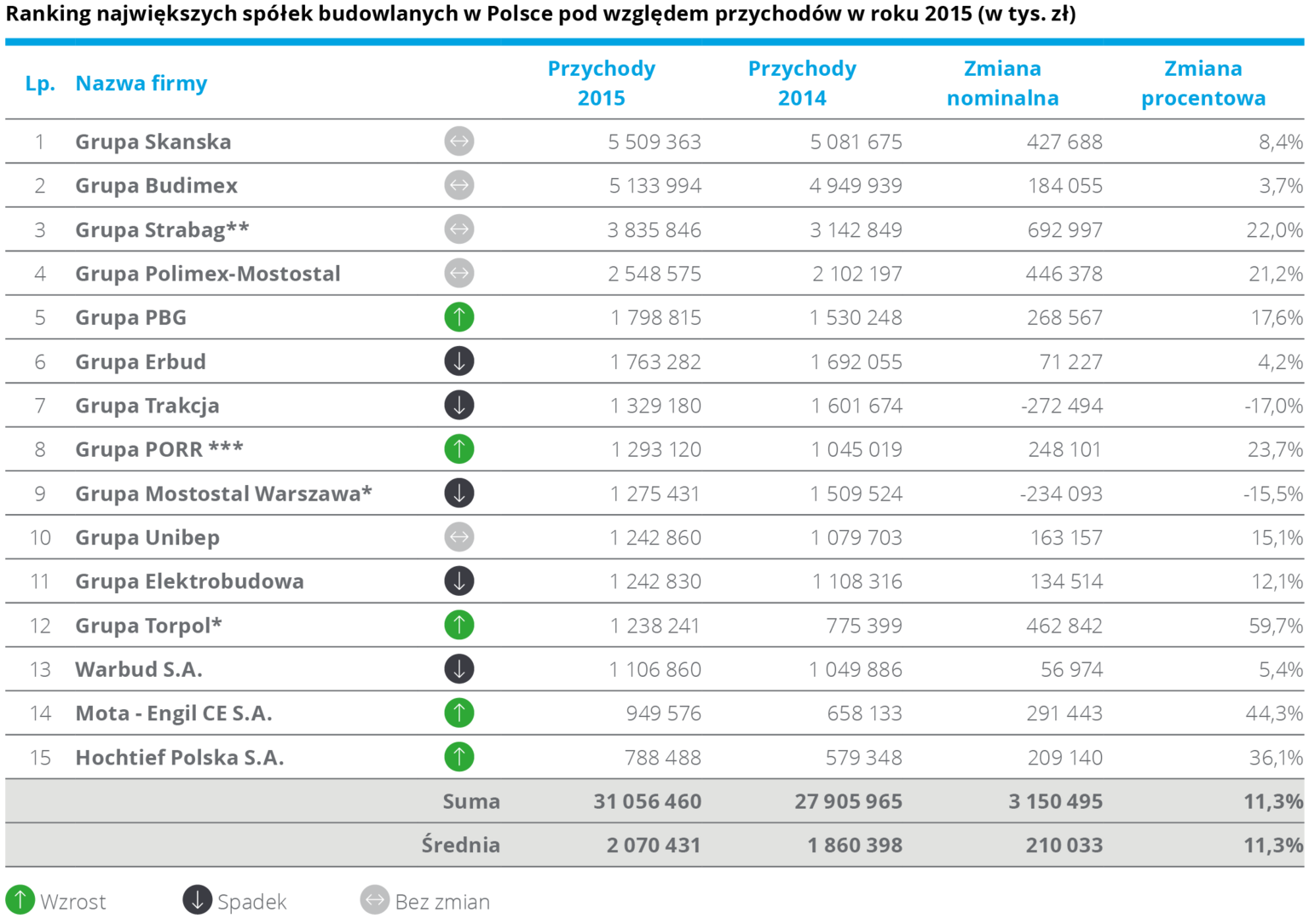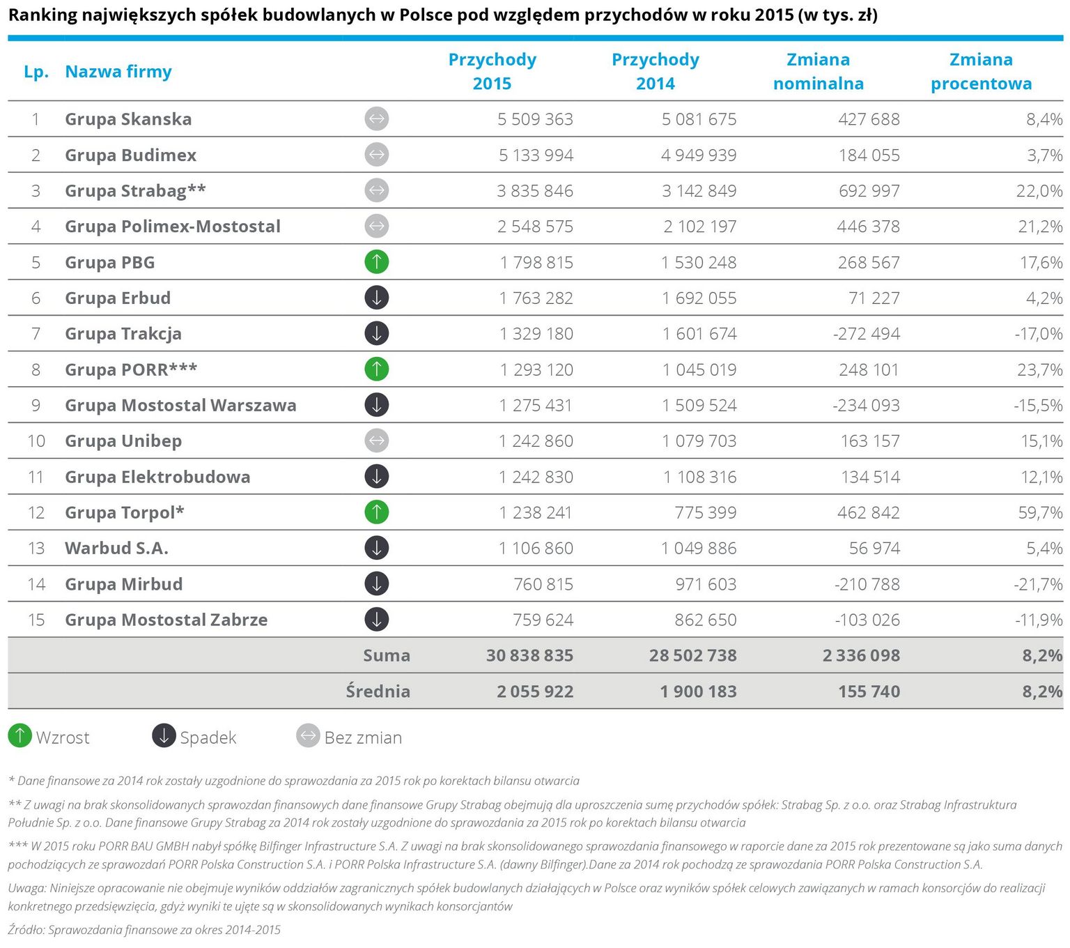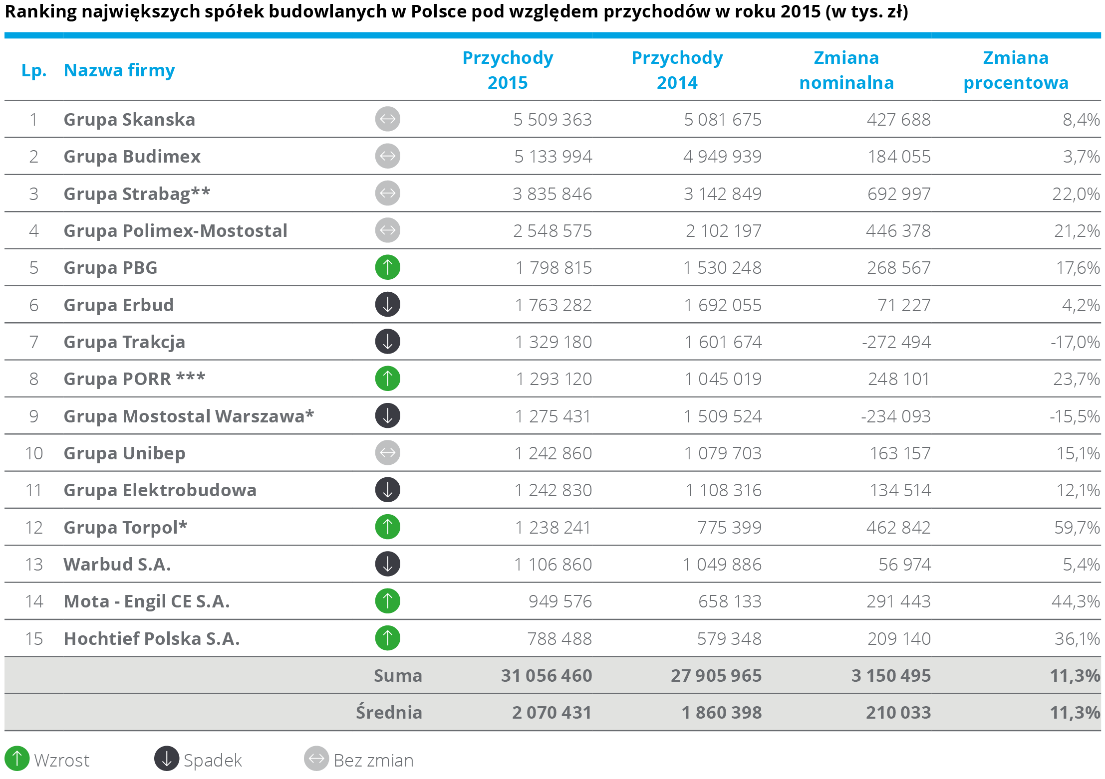 Z analizy przygotowanej przez Deloitte wynika, że w 2015 roku ł?czne przychody piętnastu największych spółek wzrosły o blisko 2,3 mld zł, co stanowi ponad 8,2 proc. wzrost rok do roku. Było to skorelowane z lepszym wynikiem zarówno na poziomie działalności operacyjnej, jak i na poziomie wyniku netto. „Po raz pierwszy wszystkie podmioty tworz?ce poprzedni ranking, znalazły się w nim również w kolejnym roku. Podobnie jak poprzednio czołówka pozostała bez zmian. Tegoroczne zestawienie ponownie otwiera Grupa Skanska, uzyskuj?c przychody na poziomie 5,5 mld zł, o 8,4 proc. więcej niż w 2014 roku” – mówi Maciej Krasoń, Partner, Lider Sektora Nieruchomości i Budownictwa w Deloitte Polska. Na drugim miejscu znalazła się Grupa Budimex, kontrolowana przez hiszpański Ferrovial, z przychodami sięgaj?cymi 5,1 mld zł, co stanowi wzrost o 3,7 proc. rok do roku. Trzeci jest austriacki Strabag, który zanotował wzrost przychodów o 22 proc. w stosunku do poprzedniego roku do poziomu 3,8 mld zł. Średnia przychodów dla największych podmiotów w 2015 nie osi?gnęła jeszcze poziomu obserwowanego w 2011 roku, w którym był on zwi?zany z dużymi inwestycjami infrastrukturalnymi prowadzonymi w Polsce przed EURO 2012 oraz z kumulacj? pierwszej perspektywy finansowej Unii Europejskiej.