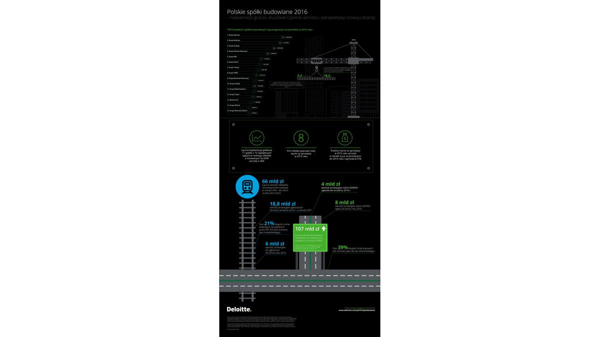 Kapitalizacja jedenastu największych spółek budowlanych notowanych na warszawskim parkiecie na koniec ubiegłego roku wyniosła 8,3 mld zł i wzrosła w stosunku do wartości z końca grudnia 2014 roku o 2,2 mld zł (wzrost o 36 proc.). „Wyniki sektora budowlanego na GPW zależ? przede wszystkim od Budimex, którego udział w kapitalizacji największych spółek z tego sektora notowanych na GPW i ujętych równocześnie w rankingu największych spółek budowlanych Deloitte wynosi prawie 60 proc.” – mówi Łukasz Michorowski, Dyrektor w Dziale Audytu Deloitte.