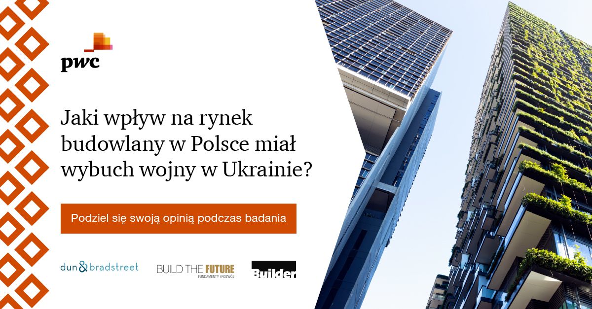 Zapraszamy Państwa do wspólnej odpowiedzi na to, i wiele innych pytań przy okazji kolejnej edycji Badania branży budowlanej w Polsce prowadzonego w ramach projektu “Build The Future” przez magazyn “Builder” i firmę doradczą PwC Polska oraz Dun & Bradstreet.