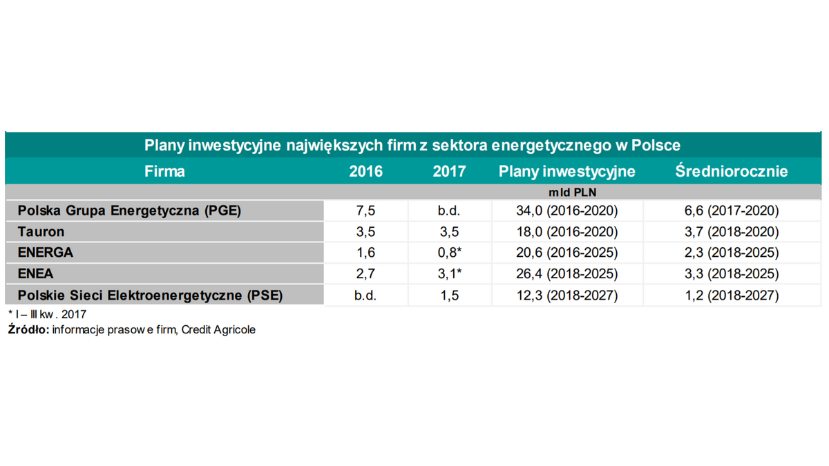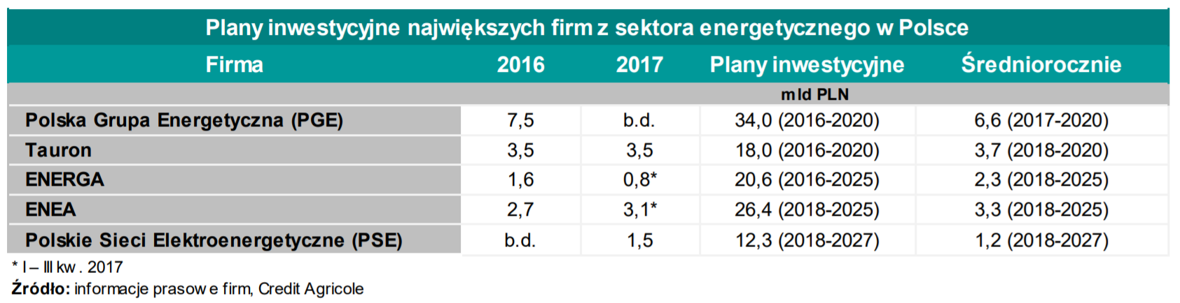 Precyzyjna prognoza przyszłych nakładów na środki trwałe w sektorze energetycznym jest utrudniona ze względu na brak scentralizowanej informacji o planach inwestycyjnych przedsiębiorstw z tego sektora. Zgodnie z obowi?zuj?cymi przepisami Urz?d Regulacji Energetyki co dwa lata zbiera informacje nt. planów inwestycyjnych wytwórców energii elektrycznej w horyzoncie 15 lat. Dane te jednak nie s? publicznie dostępne. Tym samym w celu oszacowania przyszłych nakładów firm energetycznych posłużyliśmy się publikowanymi przez największe przedsiębiorstwa z tego sektora dokumentami (strategie rozwoju, plany inwestycyjne) oraz informacjami prasowymi. Większość z tych firm nie podaje jednak informacji nt. konkretnego profilu wydatków w najbliższych latach, natomiast publikuje tylko zagregowan? wartość nakładów na środki trwałe w kilkuletnim horyzoncie. Przyjmuj?c w uproszczeniu, że wydatki te będ? rozdysponowane równomiernie pomiędzy poszczególne lata, do co najmniej 2020 r. można oczekiwać stabilnego strumienia nowych inwestycji w wysokości ok. 17 mld zł rocznie w największych firmach energetycznych. Jest to wartość zbliżona do poziomów obserwowanych w latach 2016 i 2017 (por. tabela).
