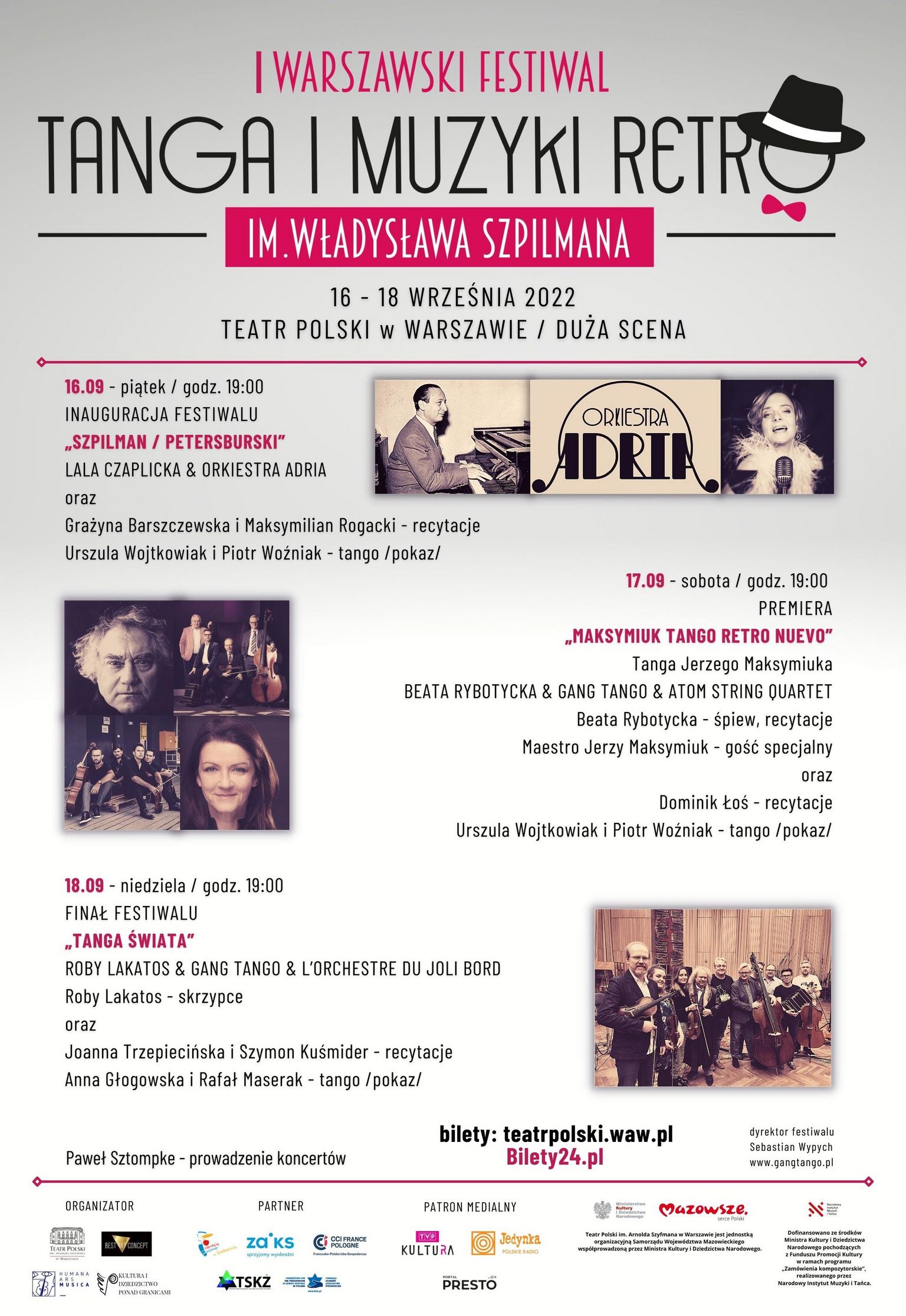 - Otwarcie Festiwalu (16.09) to koncert "SZPILMAN I PETERSBURSKI " - z Lalą Czaplicką i "Orkiestra Adria" oraz recytacjami cenionych aktorów Grażyny Barszczewskiej i Maksymiliana Rogackiego oraz pokazem tanga w wykonaniu Urszuli Wojtkowiak i Piotra Wożniaka, tancerzy i mistrzów tanga argentyńskiego.