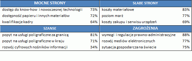 Za słabe strony uznano natomiast koszty materiałowe, poziom marży oraz koszty zakupu i serwisu urz?dzeń. Szans? dla polskiego sektora poligraficznego s? popyt na usługi poligraficzne za granic?, popyt na usługi poligraficzne w kraju oraz rozwój cyfrowych nośników informacji. Przedsiębiorcy dostrzegaj? zagrożenie w wymogach i regulacjach prawno-administracyjnych, rozwoju mediów elektronicznych oraz sytuacji gospodarczej na świecie.