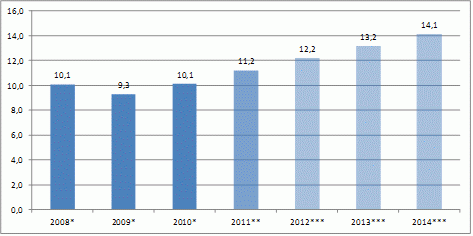 Źródło: Opracowanie własne KPMG w Polsce. * Przychody przedsiębiorstw na podstawie danych Eurostat przeliczonych wg średniego kursu NBP. ** Szacunek w oparciu o produkcję sprzedan? przedsiębiorstw powyżej 9 pracuj?cych. *** Prognoza KPMG w Polsce.
