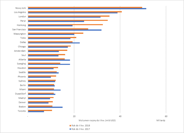 W pierwszej dziesi?tce najbardziej atrakcyjnych lokalizacji pod względem inwestycji w nieruchomości znalazło się sześć miast w USA i po dwa w Europie i Azji. Pomimo niepewności politycznej zwi?zanej z warunkami wyjścia Wielkiej Brytanii z Unii Europejskiej, Londyn jest nadal głównym rynkiem europejskim dzięki znacz?cym transakcjom w sektorze nieruchomości biurowych.