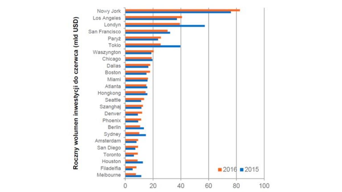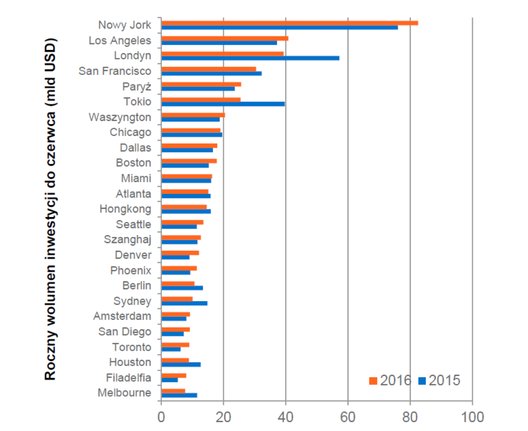 Zmieniaj? się priorytety inwestorów zagranicznych, o czym świadcz? większe przepływy kapitału zagranicznego w Ameryce i Azji niż w Europie, a także zmiany w rankingu miast. Londyn, w którym wartość transakcji inwestycyjnych zmniejszyła się z 39 mld USD do 25 mld USD, utracił pozycję największego rynku inwestycyjnego świata na rzecz Nowego Jorku. Wskutek niewielkiej podaży aktywów i konkurencji na lokalnych rynkach na znaczeniu straciły także inne duże miasta, w tym Tokio, Waszyngton i Frankfurt. Pod względem wolumenu inwestycji zagranicznych w grupie 25 najbardziej atrakcyjnych lokalizacji znalazło się dziesięć miast z regionu EMEA, dziewięć z Ameryki Północnej i sześć z regionu Azji i Pacyfiku.