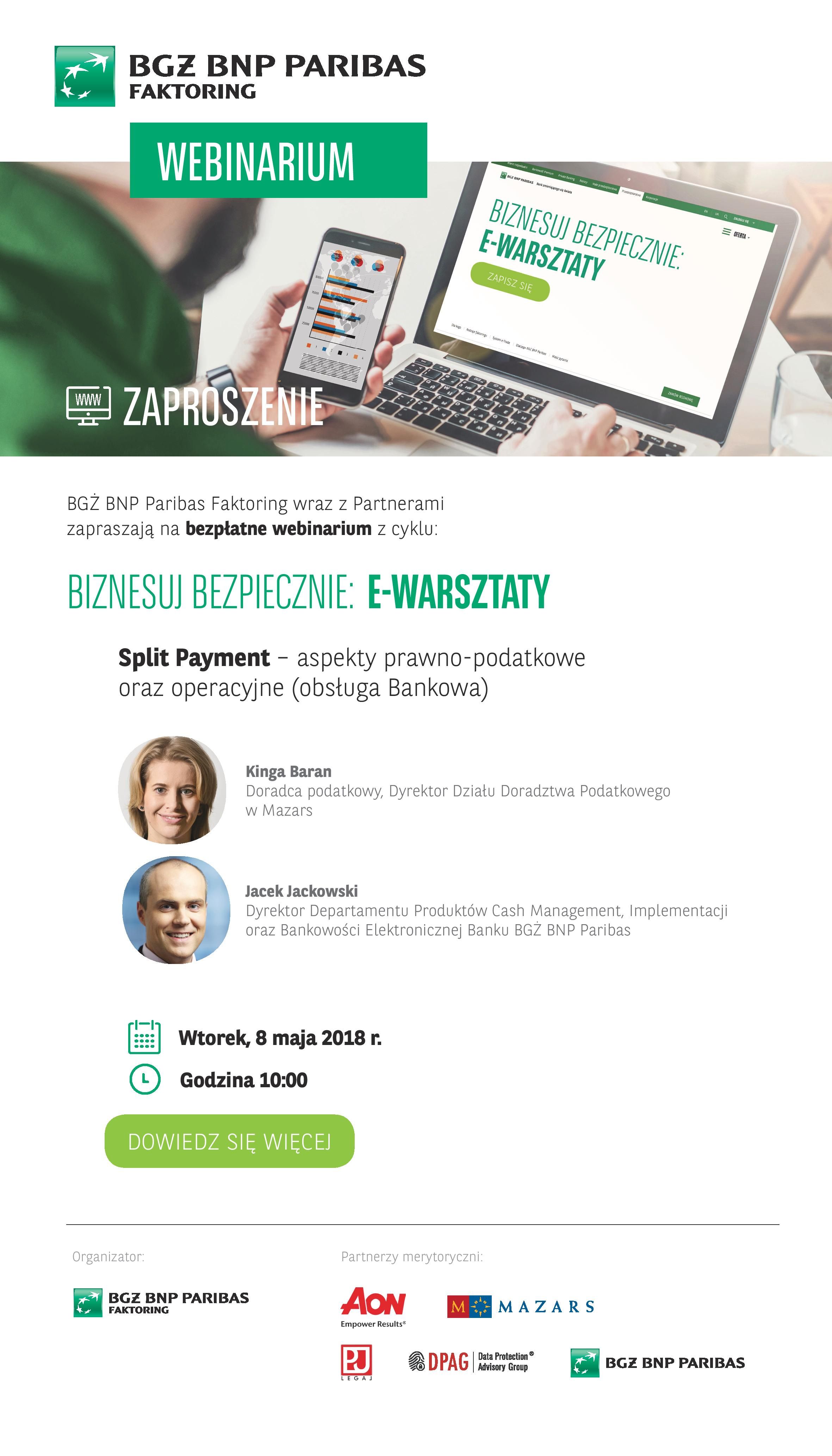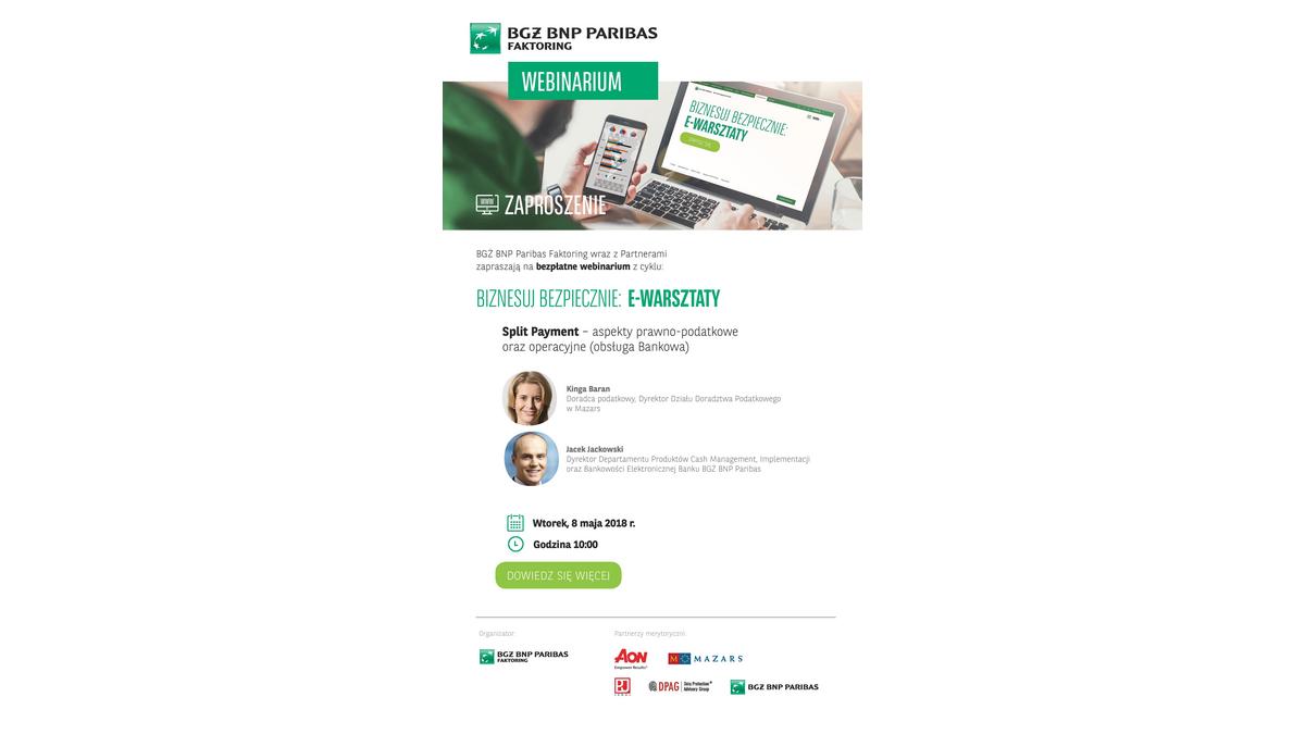 <p style="text-align: justify;">Zapraszamy na kolejne webinarium, które odbędzie się <strong>8 maja o godzinie 10:00.</strong> Tematem warsztatu będzie <strong>Split Payment - aspekty prawno-podatkowe oraz operacyjne (obsługa Bankowa).</strong> Szkolenie poprowadzą: Kinga Baran Doradca Podatkowy, Dyrektor Działu Doradztwa Podatkowego w Mazars oraz Jacek Jackowski Dyrektor Departamentu Produktów Cash Management, Implementacji oraz Bankowości Elektronicznej Banku BGŻ BNP Paribas. Podczas warsztatu nasi eksperci wyjaśnią co to jest split payment, jakie są szanse i zagrożenia związane z mechanizmem podzielonej płatności oraz jak będzie on działać w systemach bankowych.</p>