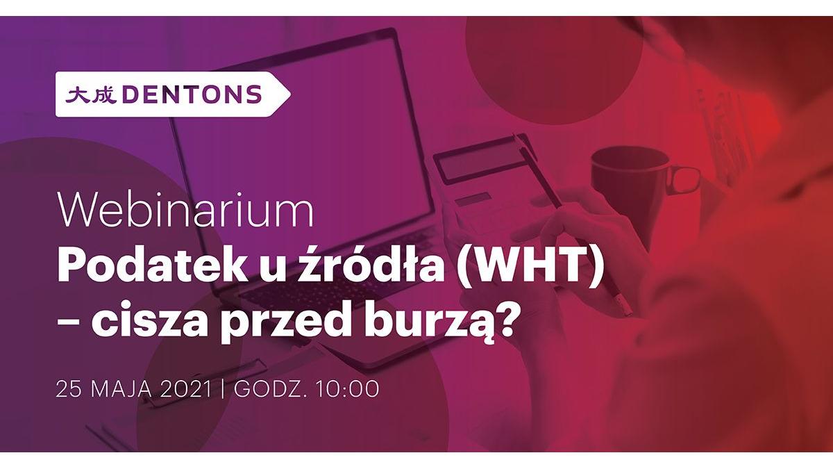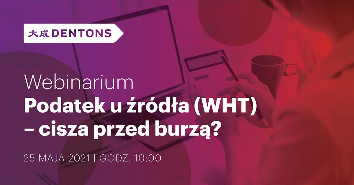 Kancelaria Dentons zaprasza na spotkanie online, podczas którego Dariusz Stolarek, partner w Zespole Prawa Podatkowego, Dentons, oraz Aleksandra Rutkowska, counsel kierująca Praktyką Postępowań Podatkowych w Zespole Prawa Podatkowego, Dentons, omówią praktyczne aspekty stosowania przepisów i rozliczeń WHT oraz podzielą się swoimi najnowszymi doświadczeniami.
