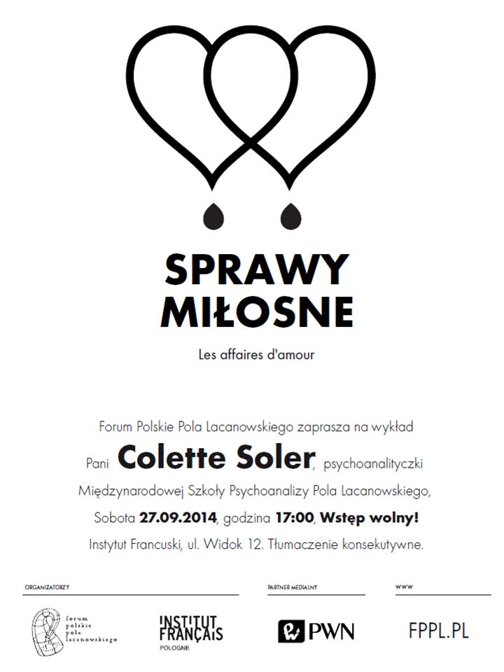 <p style="text-align: justify;">Forum Polskie Pola Lacanowskiego zaprasza do udziału w spotkaniach z Colette Soler, psychoanalityczką Międzynarodowej Szkoły Psychoanalizy Pola Lacanowskiego, EPFCL. Spotkania odbędą się w dniach 27-28 września 2014 r. w Warszawie. Stanowią one kontynuację nauczania prowadzonego przez psychoanalityków EPFCL dla Forum Polskiego oraz serii wykładów skierowanych do polskiej publiczności.</p>