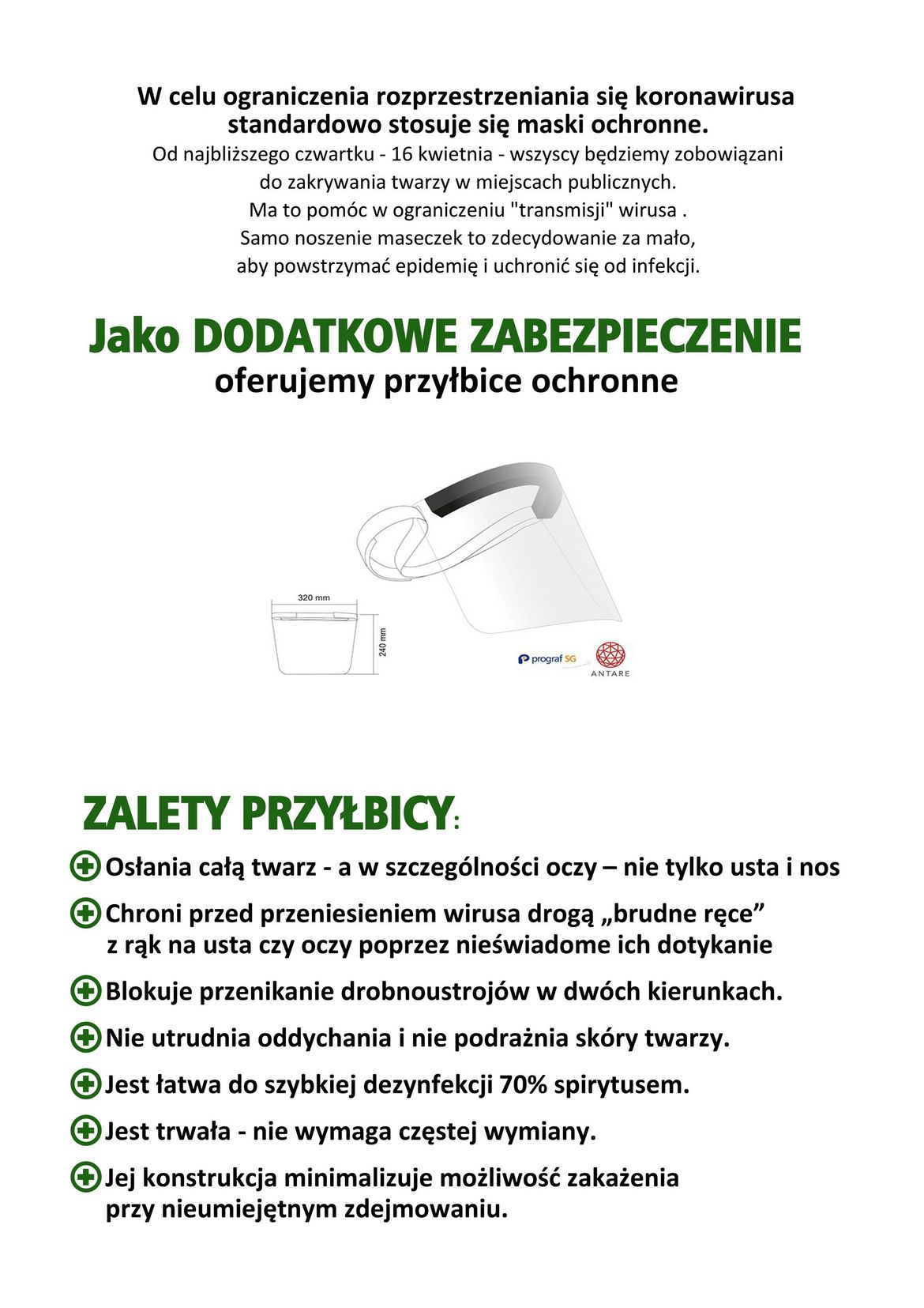 Mając na uwadze nasze wspólne dobro, którym aktualnie jest personel medyczny zachęcamy Państwa wsparcia naszej akcji, poprzez zakup przyłbic dla szpitali i przekazania ich dowolnie wybranej placówce.