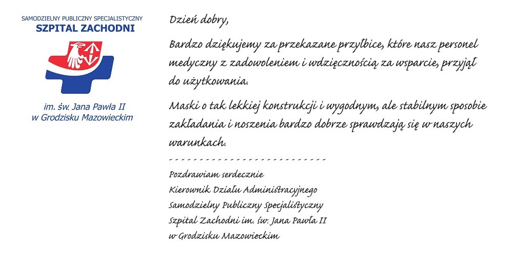 Prograf SG wspiera swoją małą ojczyznę! Pierwsze partie trafiły już min. do szpitala w Grodzisku czy Pruszkowie, poniżej dzielimy się z Państwem pierwszą z rekomendacji z naszego zaprzyjaźnionego szpitala Zachodniego.