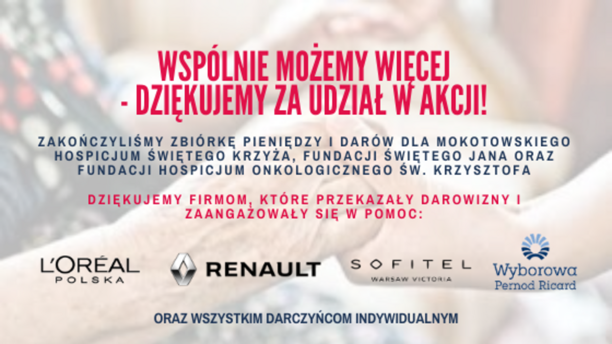 Dziękujemy firmom: L'Oréal, Wyborowa Pernod Ricard, Sofitel Warsaw Victoria oraz Renault za ich zaangażowanie w akcję. Dziękujemy również darczyńcom indywidualnym, którzy zdecydowali się swoją cegiełką wesprzeć potrzebujące instytucje.