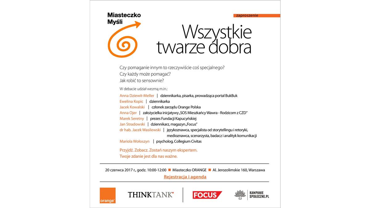 <p style="text-align: justify;">Zapraszamy na debatę "Wszystkie twarze dobra" organizowaną przez portal kampaniespoleczne.pl oraz Orange. Spotkanie odbędzie się 20 czerwca 2017 r., godz. 10:00-12:00.</p>
