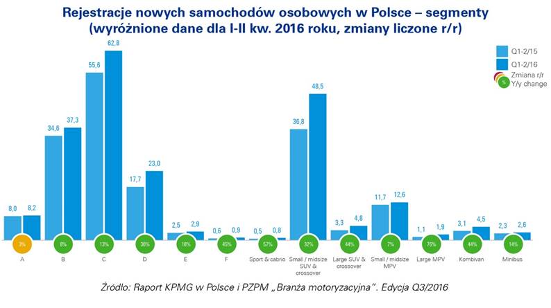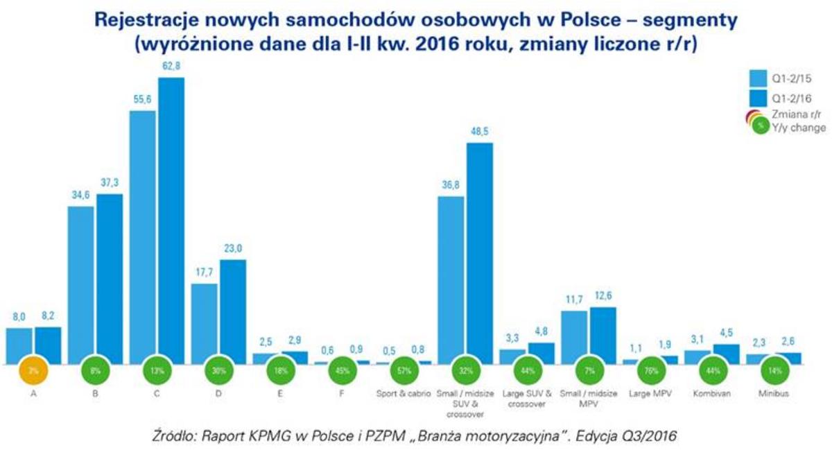 W okresie od stycznia do czerwca 2016 roku najsilniej wzrósł popyt na duże MPV (76,4% r/r) oraz samochody sportowe i cabrio (56,7% r/r), samochody z segmentu F (45,1% r/r), a także na kombivany (44,2%) oraz duże SUV-y i crossovery (43,9% r/r).