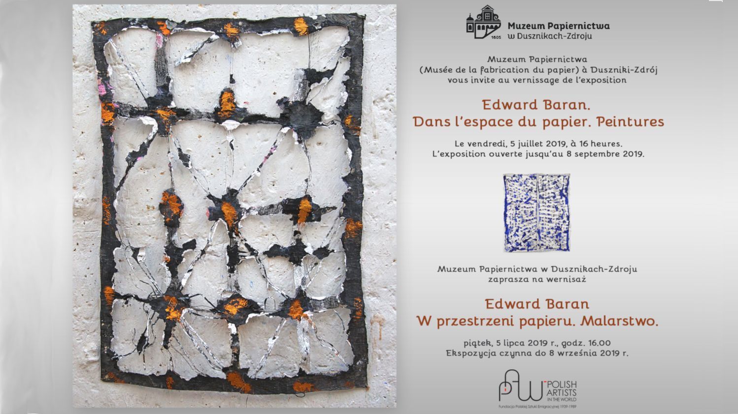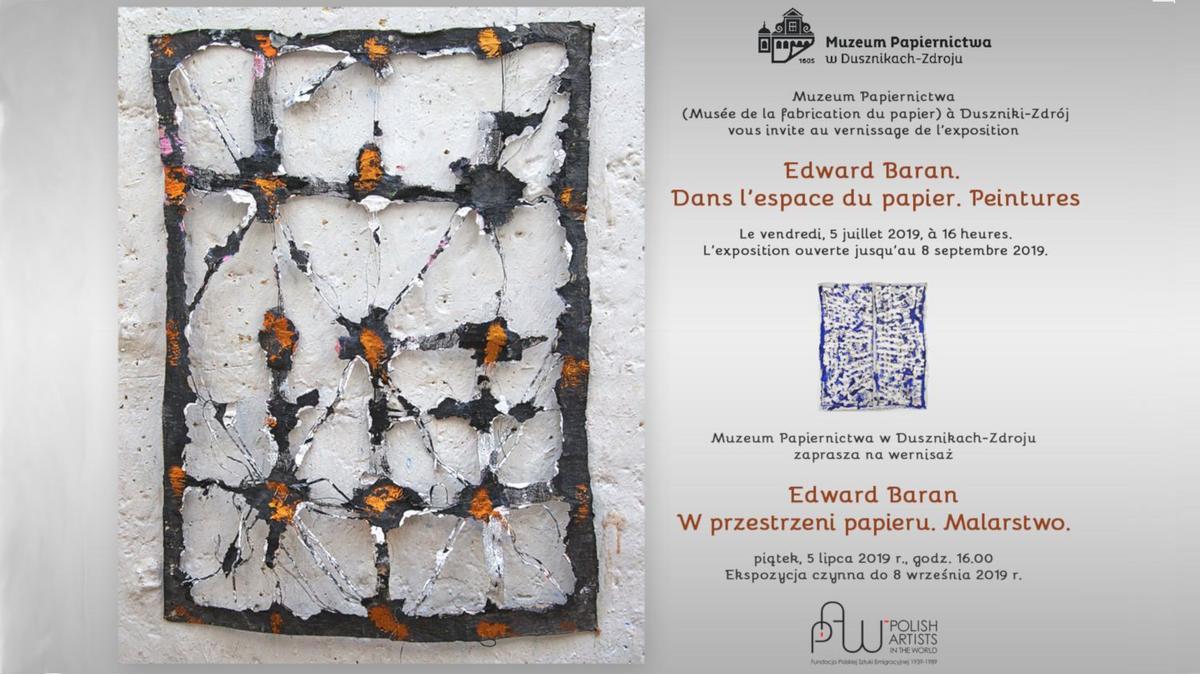 Fundacja Polskiej Sztuki Emigracyjnej 1939-1989, we współpracy z Muzeum Papiernictwa w Dusznikach Zdroju, organizuje wystawę malarstwa Edwarda Barana, artysty o polskich korzeniach, który mieszka i tworzy we Francji, w Angers już od ponad 50 lat.