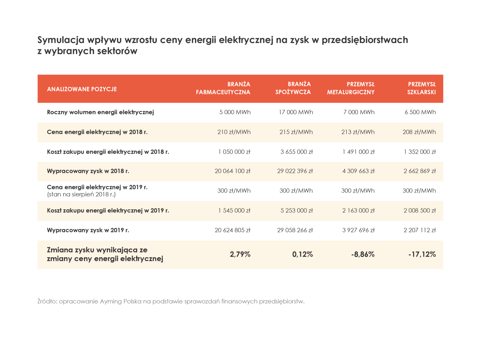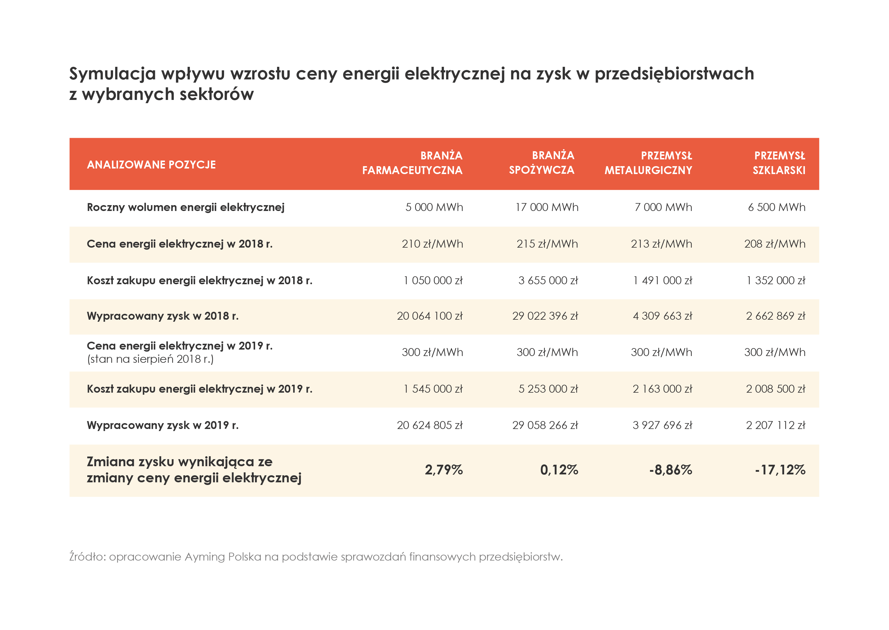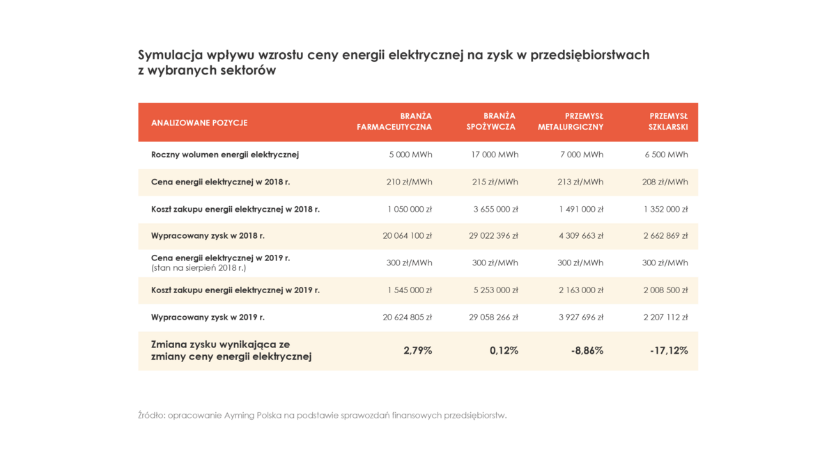 Na podstawie ubiegłorocznych sprawozdań finansowych przedsiębiorstw z różnych sektorów, eksperci Ayming Polska przygotowali symulację przedstawiaj?c? potencjalny wpływ znacznego wzrostu ceny energii elektrycznej na zysk tych podmiotów. Analizie poddano przedsiębiorstwa z czterech branż: farmaceutycznej, spożywczej, metalurgicznej i produkcji szkła. Jak wynika z analizy, wzrost ceny energii elektrycznej nie powinien mieć istotnego wpływu na zysk przedsiębiorstwa z branży farmaceutycznej. Inaczej wygl?da sytuacja w branży spożywczej, gdzie z powodu większej ceny energii przedsiębiorstwo może stracić cał? dynamikę zysku za 2019 rok. Zdecydowanie największe straty mog? ponieść przemysłowe przedsiębiorstwa energochłonne. W spółce z przemysłu metalurgicznego spadek zysku może wynieść 8,86 proc., a w przypadku przedsiębiorstwa zajmuj?cego się produkcj? szkła – aż 17,12 proc.