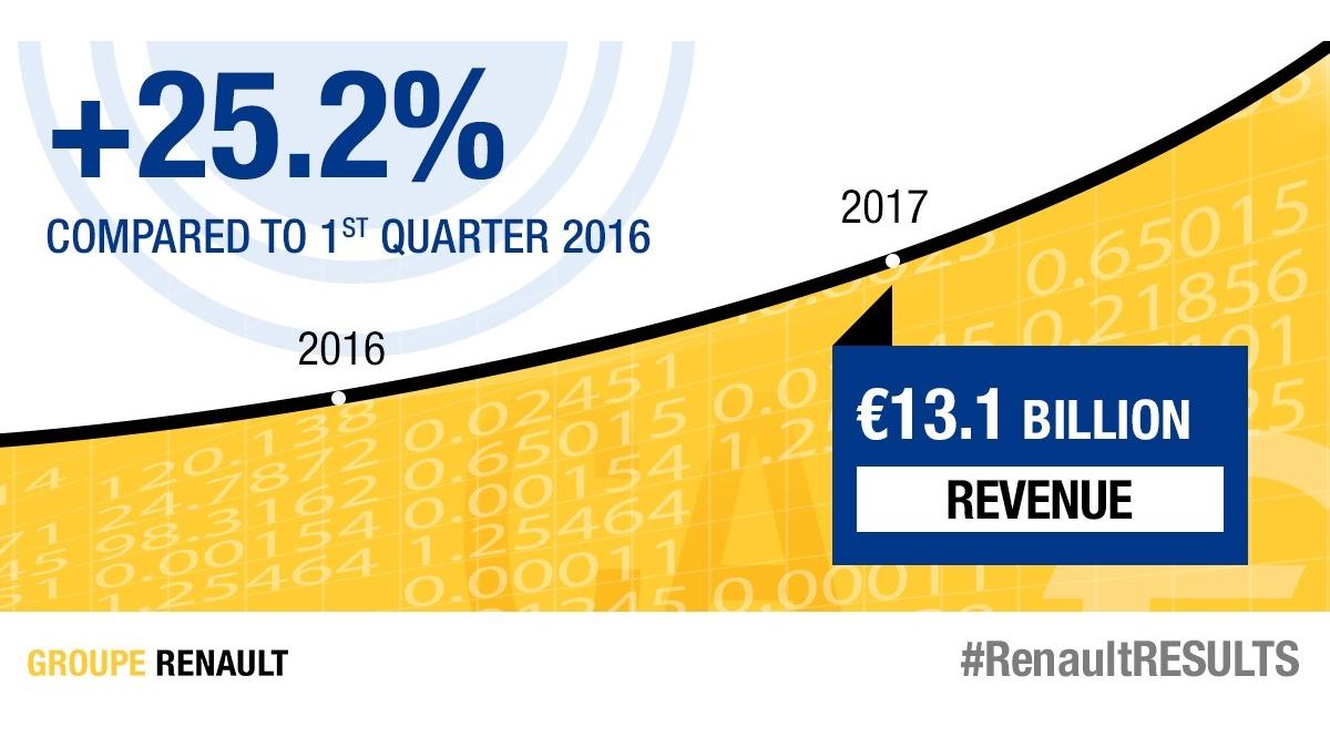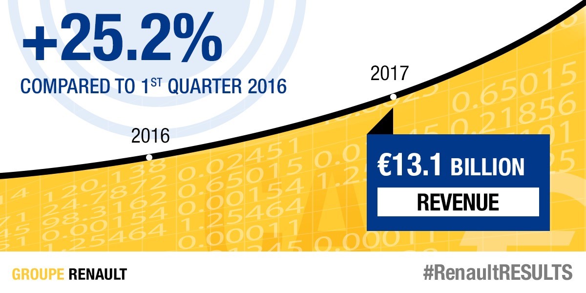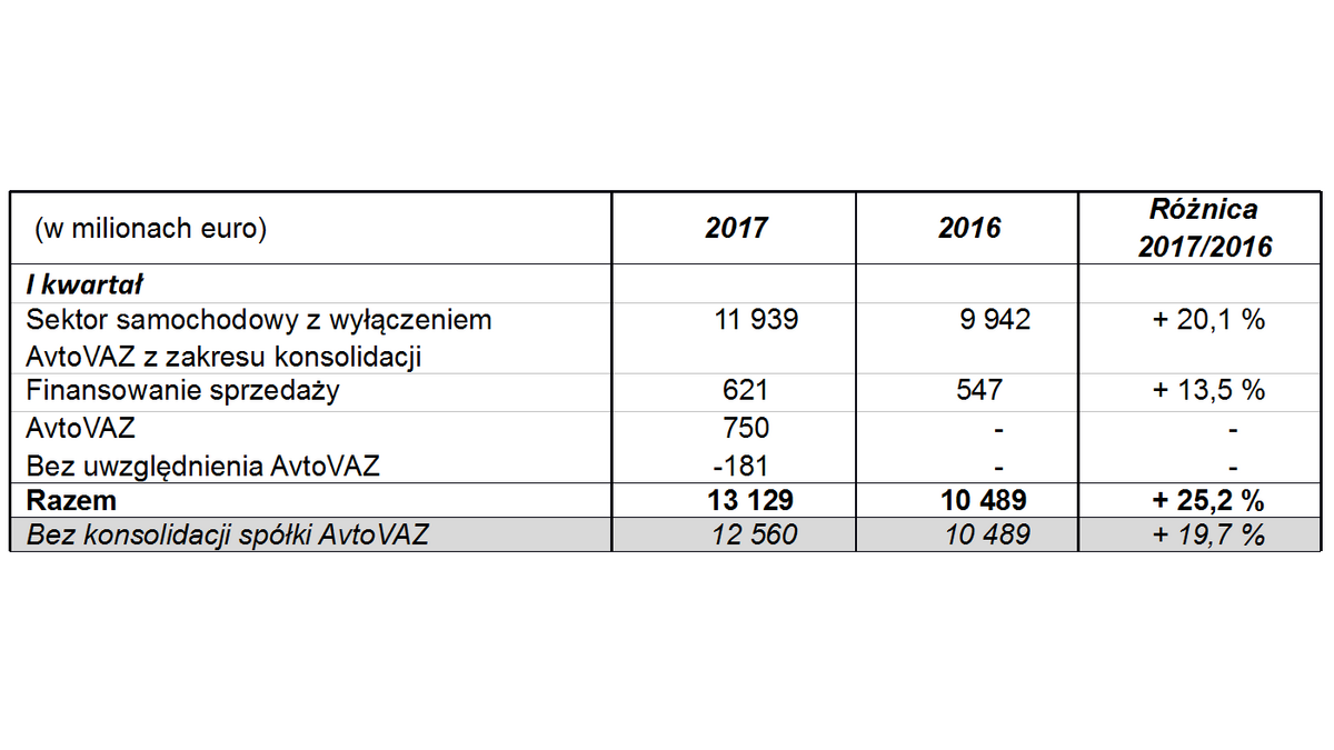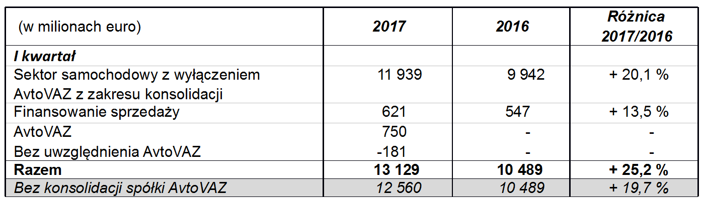 W pierwszym kwartale 2017 r. obroty Grupy osi?gnęły 13,129 miliarda euro (+ 25,2%). Bez uwzględnienia konsolidacji AvtoVAZ obroty wzrosły o 19,7% do 12,56 miliarda euro (+18,4% bez uwzględnienia różnic kursowych).