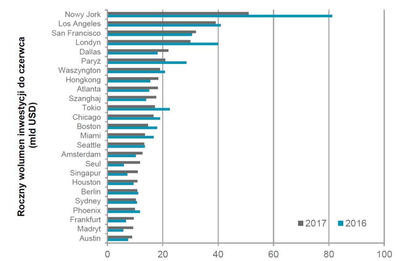 W ci?gu ostatnich 12 miesięcy do czerwca 2017 roku prawie połowa globalnego wolumenu transakcji inwestycyjnych przypadła na pierwsze 25 miast rankingu, przy czym w niektórych odnotowano znaczny spadek obrotów. Nowy Jork jest szósty rok z rzędu najbardziej atrakcyjn? lokalizacj? pod względem inwestycji w nieruchomości pomimo mniejszej o 37% aktywności inwestorów w porównaniu z analogicznym okresem rok wcześniej. Wskutek spadku wolumenu transakcji o 25% Londyn znalazł się poza pierwsz? trójk?. Z kolei w Paryżu wartość obrotów zmniejszyła się w analizowanym okresie o 21%. Główn? przyczyn? tych spadków była niewystarczaj?ca podaż aktywów.