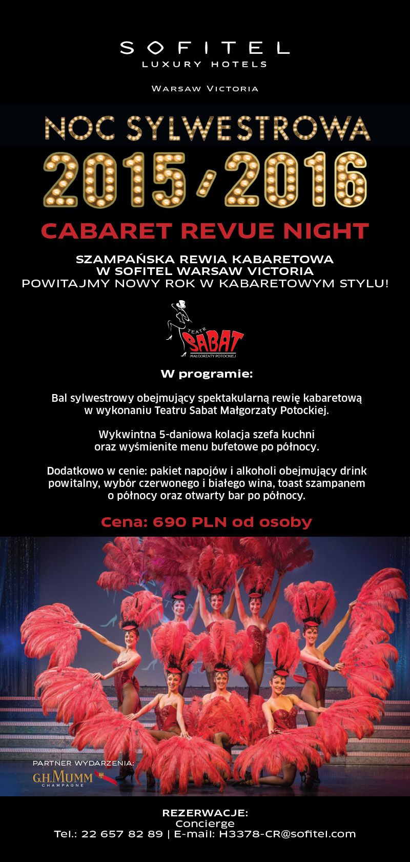 <p>Zapraszamy na szampańską zabawę sylwestrową do Sofitel Warsaw Victoria. Powitaj Nowy Rok 2016 w wyjątkowym kabaretowym stylu ze spektakularnym rewiowym pokazem przygotowanym specjalnie na tą okazję dla naszych gości przez Małgorzatę Potocką i Teatr Sabat.</p>