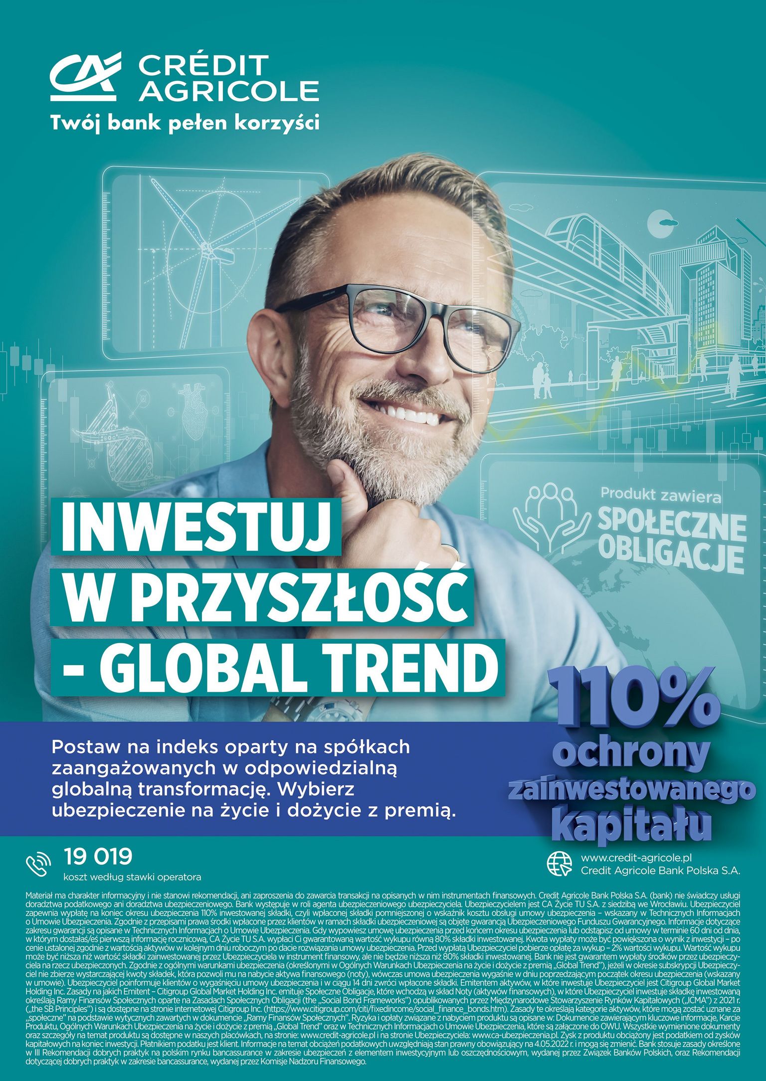 Bank Credit Agricole przypomina, że inwestowanie wiąże się z ryzykiem rynkowym. Szczegółowy opis wszystkich ryzyk związanych z produktem znajduje się w dokumencie zawierającym kluczowe informacje (KID), Karcie Produktu, Ogólnych Warunkach Ubezpieczenia na życie i dożycie z premią „Global Trend” oraz Technicznych Informacjach o Umowie Ubezpieczenia, które są dostępne na stronie www.credit-agricole.pl oraz www.ca-ubezpieczenia.pl