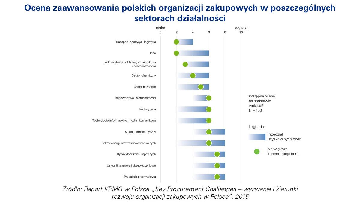Celem badania KPMG w Polsce, których wyniki zostały przedstawione w raporcie pt. „Key Procurement Challenges – wyzwania i kierunki rozwoju organizacji zakupowych w Polsce”, był przegl?d trendów dotycz?cych działania zespołów zakupowych w firmach w Polsce oraz określenie kierunku ich rozwoju. W jego wyniku możliwa była identyfikacja ich mocnych stron, obszarów wymagaj?cych poprawy oraz określenie kluczowych wyzwań, z którymi się mierz?. Badaniem objęta została grupa ponad 100 organizacji zakupowych. Badanie zostało przeprowadzone w miesi?cach sierpień-wrzesień 2015 roku metod? kwestionariusza on-line i wywiadów pogłębionych z przedstawicielami wybranych organizacji – dyrektorami i kierownikami obszaru zakupów. Do oceny i benchmarkingu poziomu dojrzałości organizacji zakupowych zostały zastosowane elementy metodyki Procurement Maturity Assessement (PMA) KPMG, która zakłada 11 obszarów merytorycznych i ponad 500 szczegółowych pytań weryfikuj?cych zaawansowanie jednostki i ewentualne luki do uzupełnienia wraz z oczekiwanym efektem finansowym wdrożenia zmian. Dobór próby był celowy, a jej zakres obejmował największe polskie organizacje ze wszystkich sektorów gospodarki, z których 46% zadeklarowało w ostatnim roku wartość wydatków zakupowych na poziomie przekraczaj?cym 500 mln PLN. Pełna treść raportu dostępna na stronie kpmg.pl.