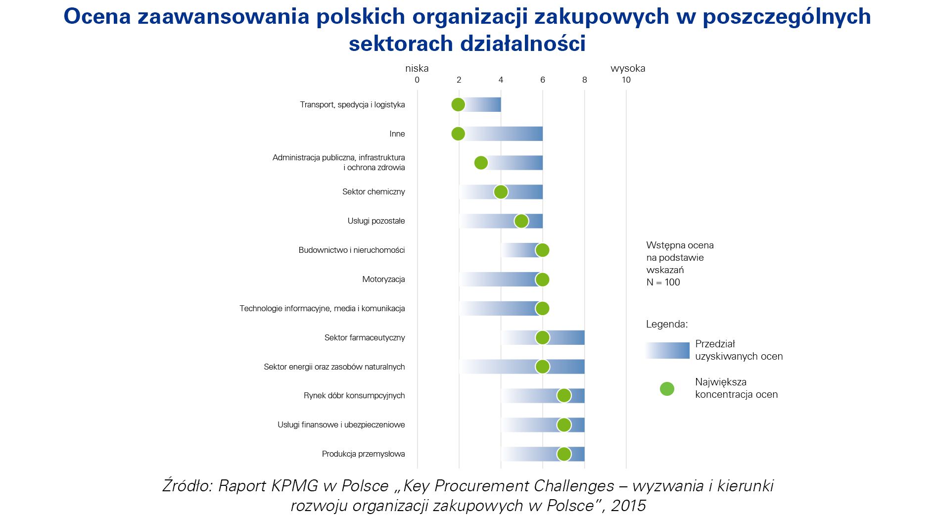 Ocena dojrzałości funkcji zakupów przedsiębiorstw działaj?cych w Polsce wskazuje, że większość z nich (ok. 75%) jest na dość wczesnym lub średnim etapie dojrzałości. Dojrzałość zakupowa polskich organizacji nie wynika bezpośrednio z sektora działalności spółki, w większości sektorów można wskazać organizacje deklaruj?ce stosowanie dobrych praktyk rynkowych w zakresie zarz?dzania funkcj? zakupów. Największy odsetek dojrzałych zakupowo organizacji zadeklarowali przedstawiciele sektora usług finansowych i ubezpieczeniowych oraz produkcji przemysłowej (ok. 40 % badanych organizacji w sektorze).