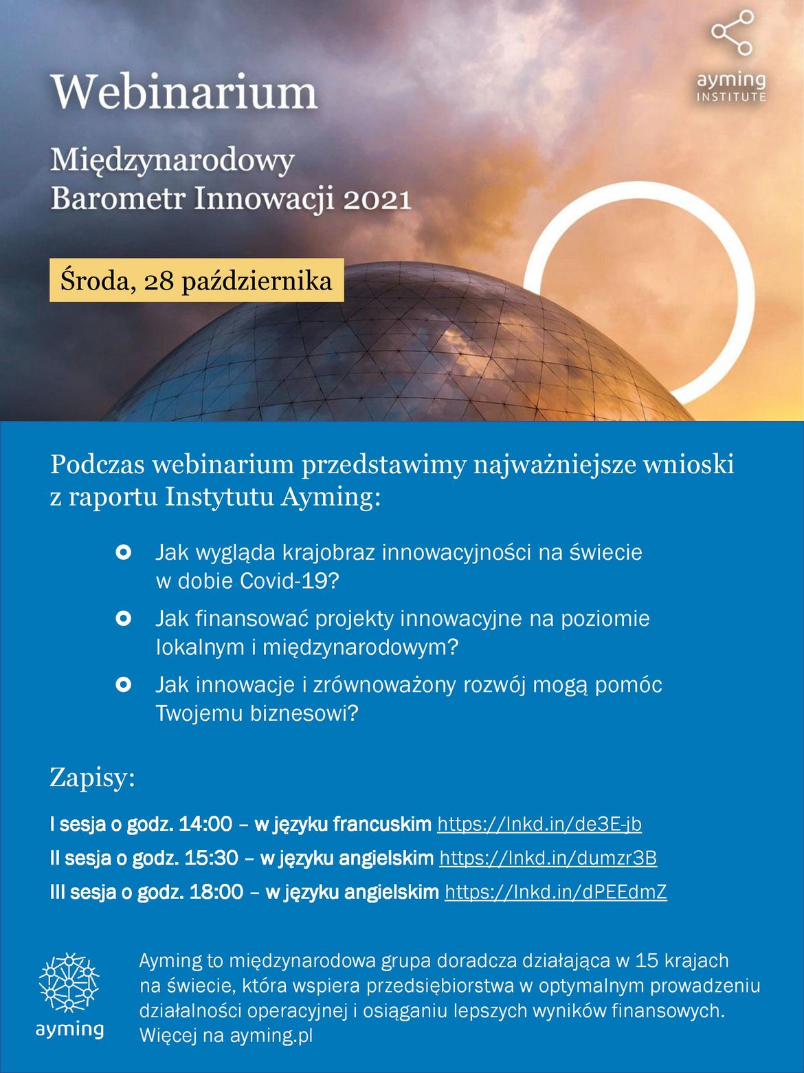 Zapraszamy na Webinarium Grupy Ayming „Międzynarodowy Barometr Innowacji 2021”. Data: 28 października, 3 sesje do wyboru. Webinarium jest bezpłatne.