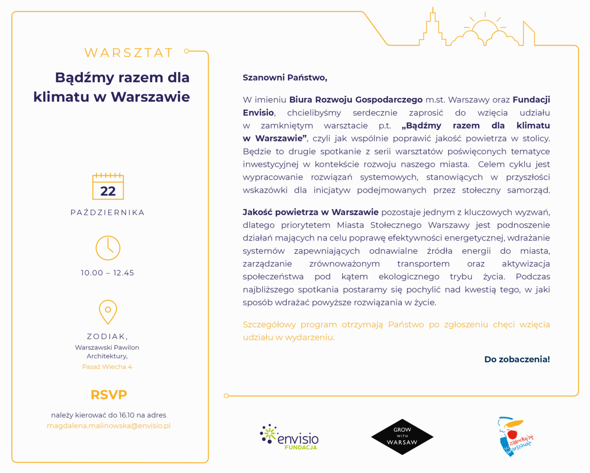 Biuro Rozwoju Gospodarczego m. st. Warszawy oraz Fundacja Envisio, zaproszają na warsztat „Bądźmy razem dla klimatu w Warszawie”, który odbędzie się 22 października w Warszawskim Pawilonie Architektury Zodiak.