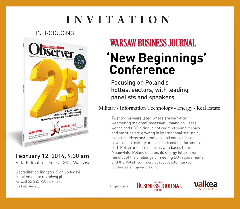<p style="text-align: justify;">Warsaw Business Journal zaprasza ma konferencję "New begining", podczas której prowadzona będzie dyskusja podsumowująca 25 lat zmian gospodarczych w Polsce. W jej trakcie odbędzie się również prezentacja nowego tytułu wydawanego przez Warsaw Business Journal.</p>