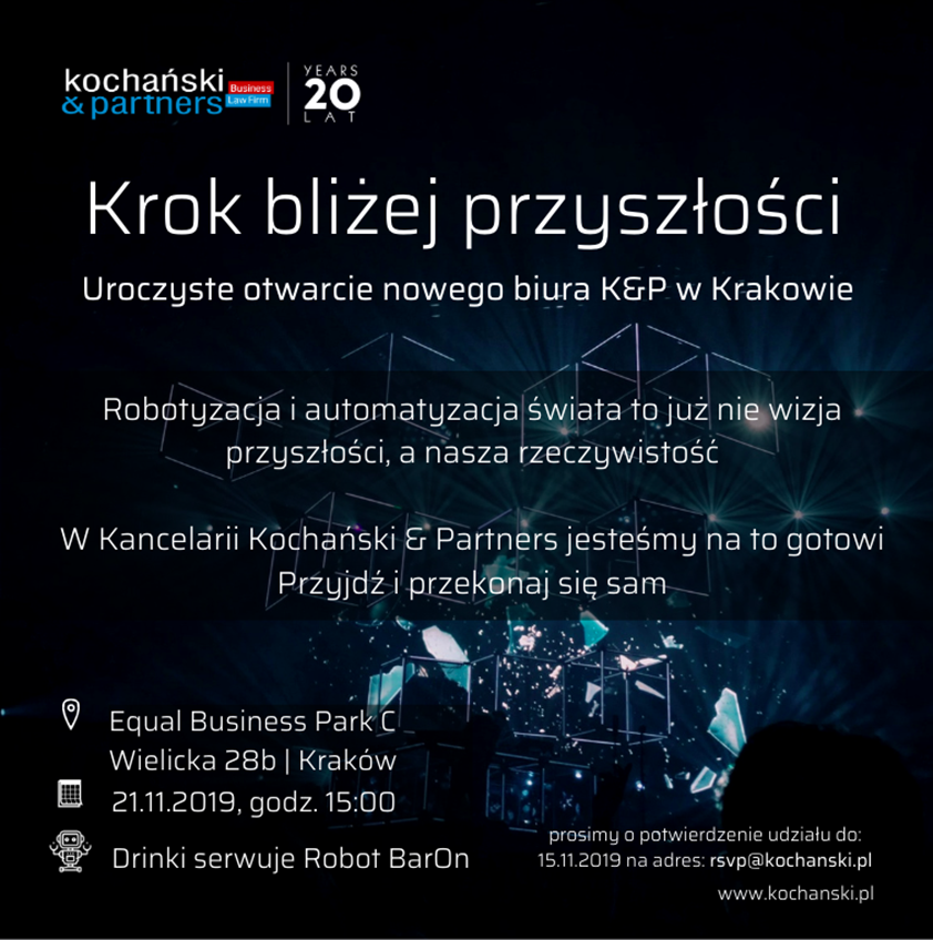 Z okazji otwarcia nowej siedziby Kancelarii Kochański & Partners w Krakowie zapraszamy do wspólnego świętowania w atmosferze rewolucji technologicznej 4.0. Gości przywita robot humanoidalny, oprawę muzyczną zapewni wiolonczela elektryczna, a drinki zaserwuje Robot BarOn. Do zobaczenia!