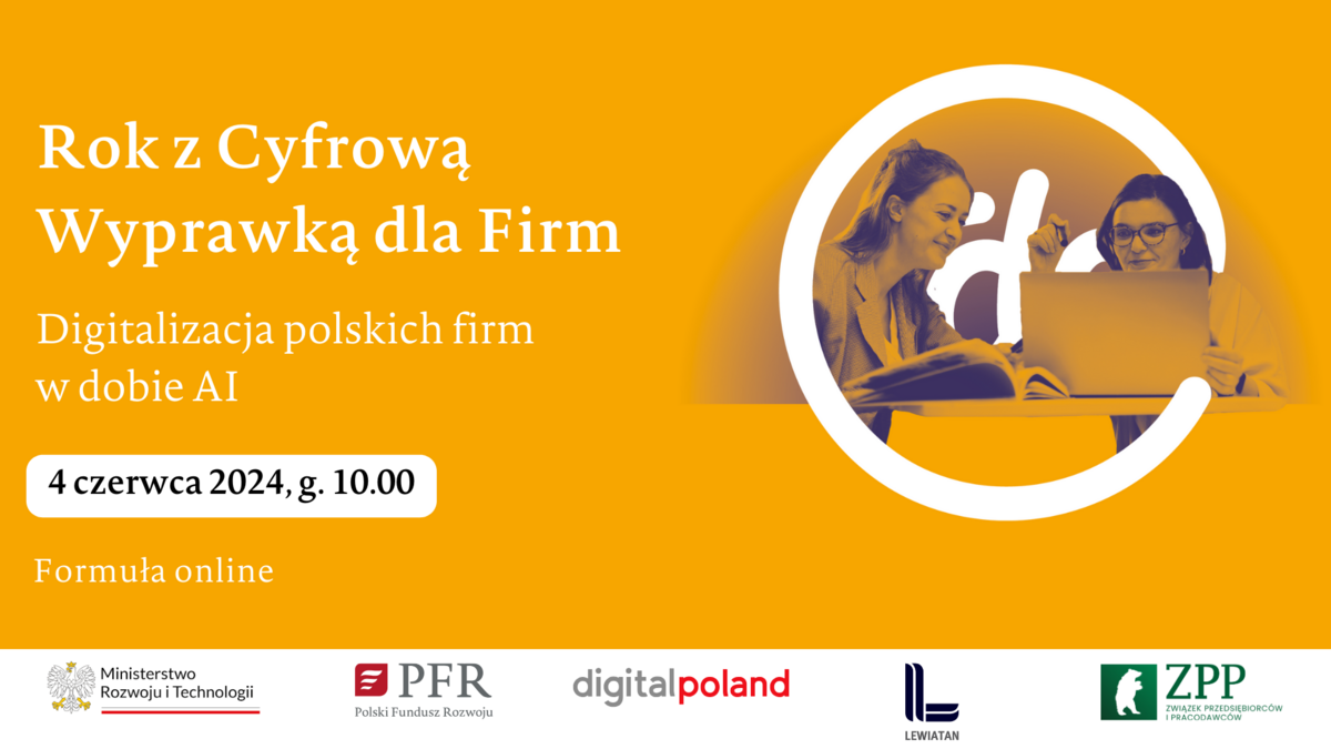 4 czerwca 2024 r. w godz. 10.00-12.00 odbędzie się spotkanie online pt. „Rok z Cyfrową Wyprawką dla Firm. Digitalizacja polskich firm w dobie AI, na które zostały zaproszone m.in. instytucje działające w cyfryzacji oraz oferujące wsparcie i rozwiązania dla przedsiębiorstw. Wśród tematów wystąpień między innymi: