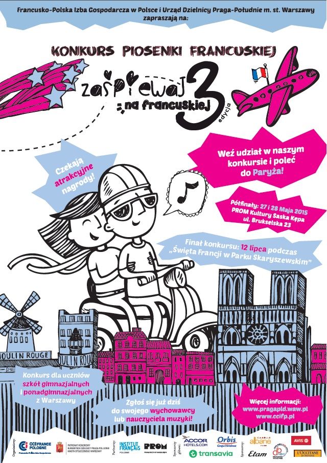 <p style="text-align: justify;">Serdecznie zapraszamy uczniów szkół gimnazjalnych i ponadgimnazjalnych z całej Warszawy do wzięcia udziału w 3-ciej edycji Konkursu Piosenki Francuskiej! Półfinały Konkursu odbędą się 27 maja – 14.00-20.00. 28 maja – 14.00 – 18.30, w PROMIE Kultury Saska Kępa ul. Brukselska 23, 03-973 Warszawa – sala kinowa.</p>