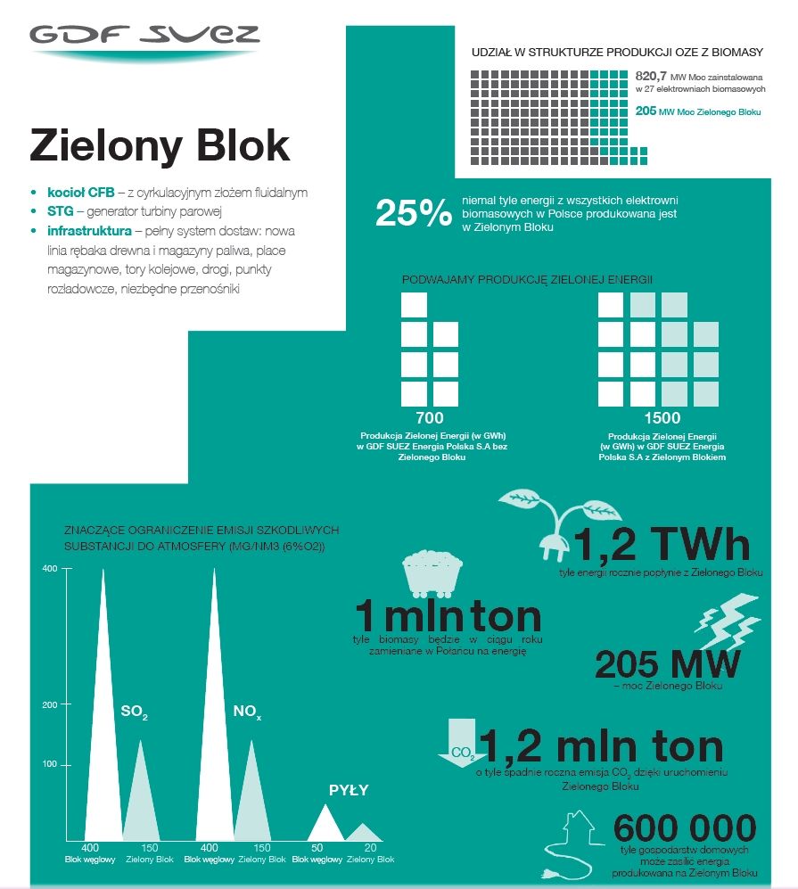 Zielony Blok to nowatorski projekt Grupy GDF SUEZ. To pierwsza na świecie inwestycja w kocioł cieplny, zdolny do opalania biomasy zrealizowany na tak? skalę. W procesie produkcji energii w nowoczesnym bloku w Połańcu udział bierze głównie biomasa argo (pochodzenia rolniczego, np. pestki, słoma, łupiny słonecznika) oraz zrębki drzewne. Produkcja energii w Zielonym Bloku przekracza 1,2 Twh na rok i daje możliwość dostarczenia energii do 600 000 gospodarstw domowych. Inwestycja pozwala na znaczne ograniczenie emisji szkodliwych gazów do atmosfery, a innowacje technologiczne wykorzystane w konstrukcji kotła sprawiaj?, że zmniejszeniu ulega zużycie energii zwi?zane z obsług? biomasy, co zapewnia Zielonemu Blokowi wyższ? sprawność działania.