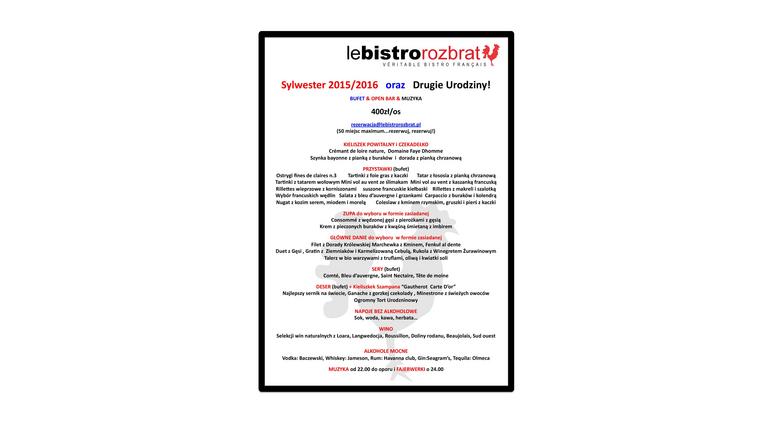 Le Bistro Rozbrat zaprasza na zabawę sylwestrową. Nie zabraknie wybornych dań kuchni francuskiej, doskonałych deserów i muzyki tanecznej bo białego…