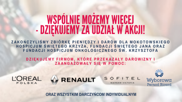 Zakończyliśmy zbiórkę pieniędzy i darów w ramach akcji "Wspólnie możemy więcej". Dziękujemy zaangażowanym firmom oraz darczyńcom indywidualnym.