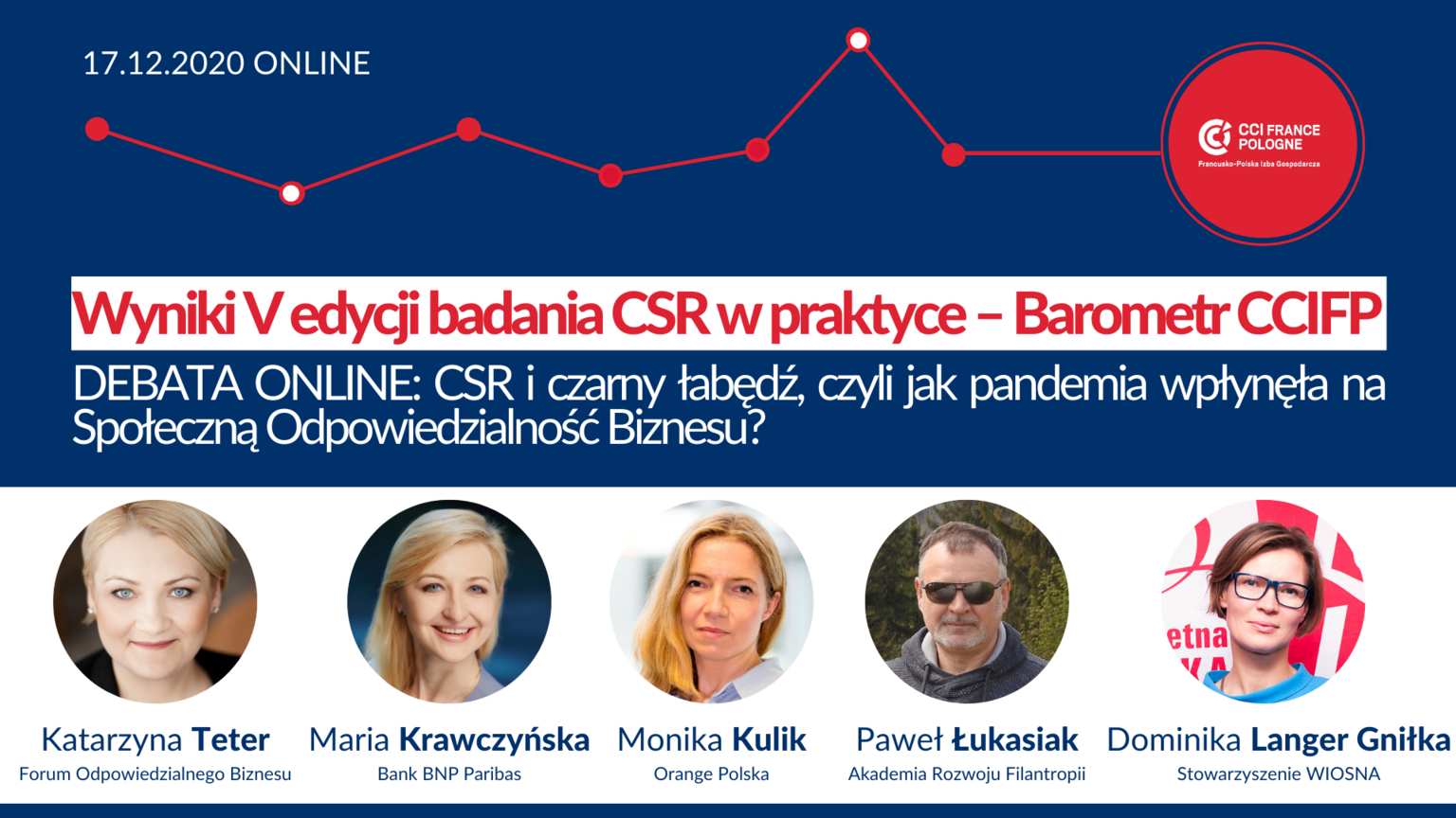 Zapraszamy na wyjątkowe wydarzenie ON-LINE. Tuż przed końcem roku poznamy wyniki piątej edycji badania CSR w praktyce - barometr CCIFP. Jest to jedyne w Polsce cykliczne badanie pokazujące poziom zaangażowania firm w działania CSR. Dowiemy się z niego m.in.:
