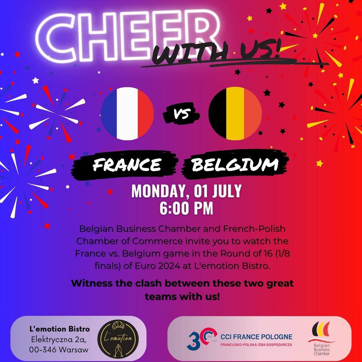 Wraz z Belgian Business Chamber zapraszamy do bistro l'Emotion na wspólne kibicowanie drużynom Francji i Belgii, które zmierzą się ze sobą w 1/8 mistrzostw Europy w piłce nożnej UEFA EURO 2024. Dla pierwszych gości CCIFP oraz BCC mamy zarezerwowany stolik. Zapraszamy!