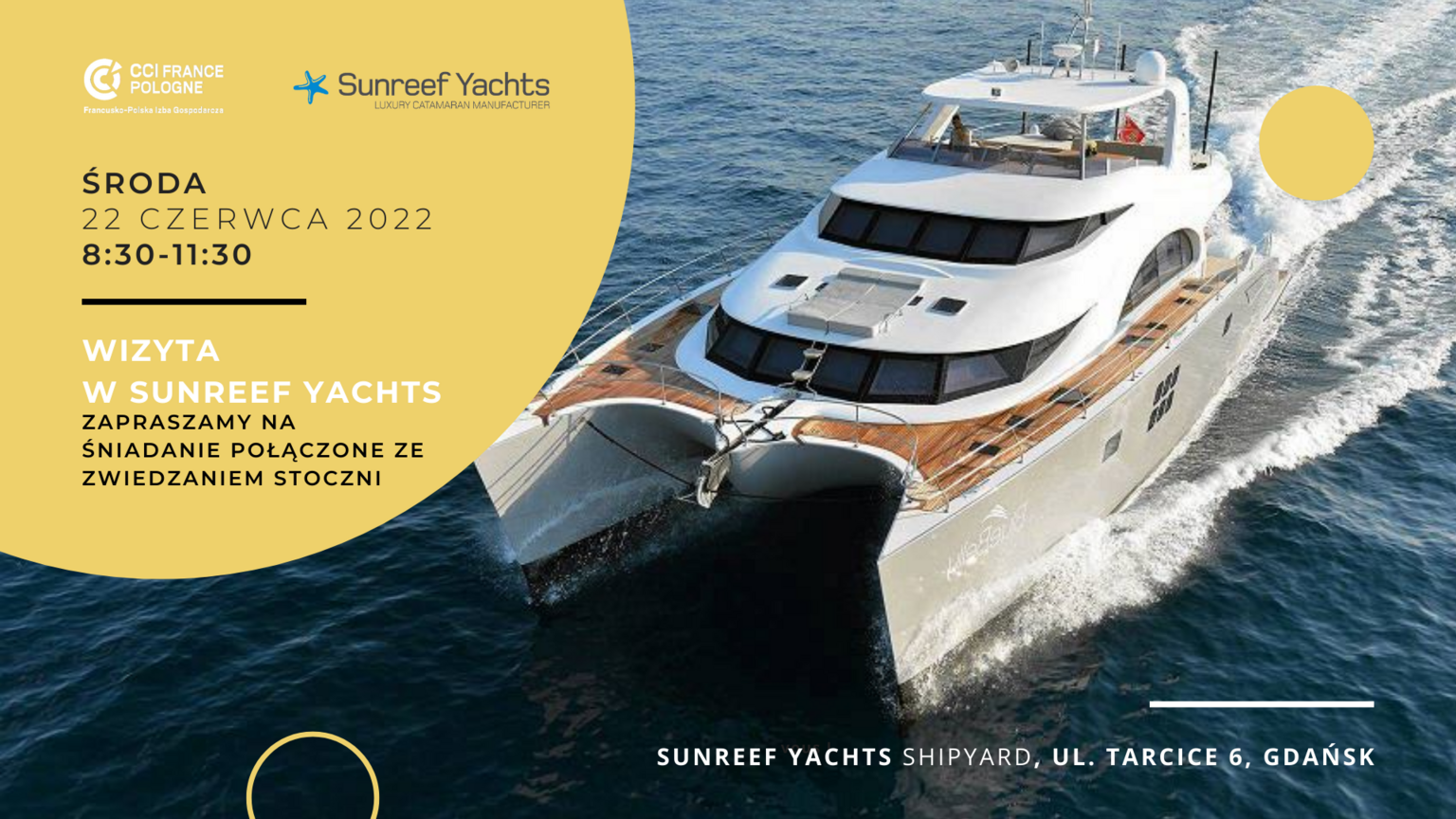 22 czerwca zapraszamy Państwa na wyjątkowe spotkanie w Sunreef Yachts – śniadanie biznesowe połączone ze zwiedzaniem terenu historycznej Stoczni Gdańskiej. Wydarzenie będzie też okazją do poznania osoby, która stoi za sukcesem i dynamicznym rozwojem stoczni Sunreef Yachts - założycielem i prezes firmy Francisem Lappem.